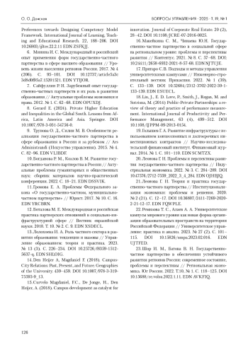 6. Минина И. С. Международный и российский опыт применения форм государственно-частного партнерства в сфере высшего образования // Уровень жизни населения регионов России. 2017. № 4 (206). C. 95-101. 10.12737/article5a3c 3d8d0f95a7.15201521. DOI: 10.12737/article5a3c3d8d0f95a7.15201521 EDN: YTIJOR