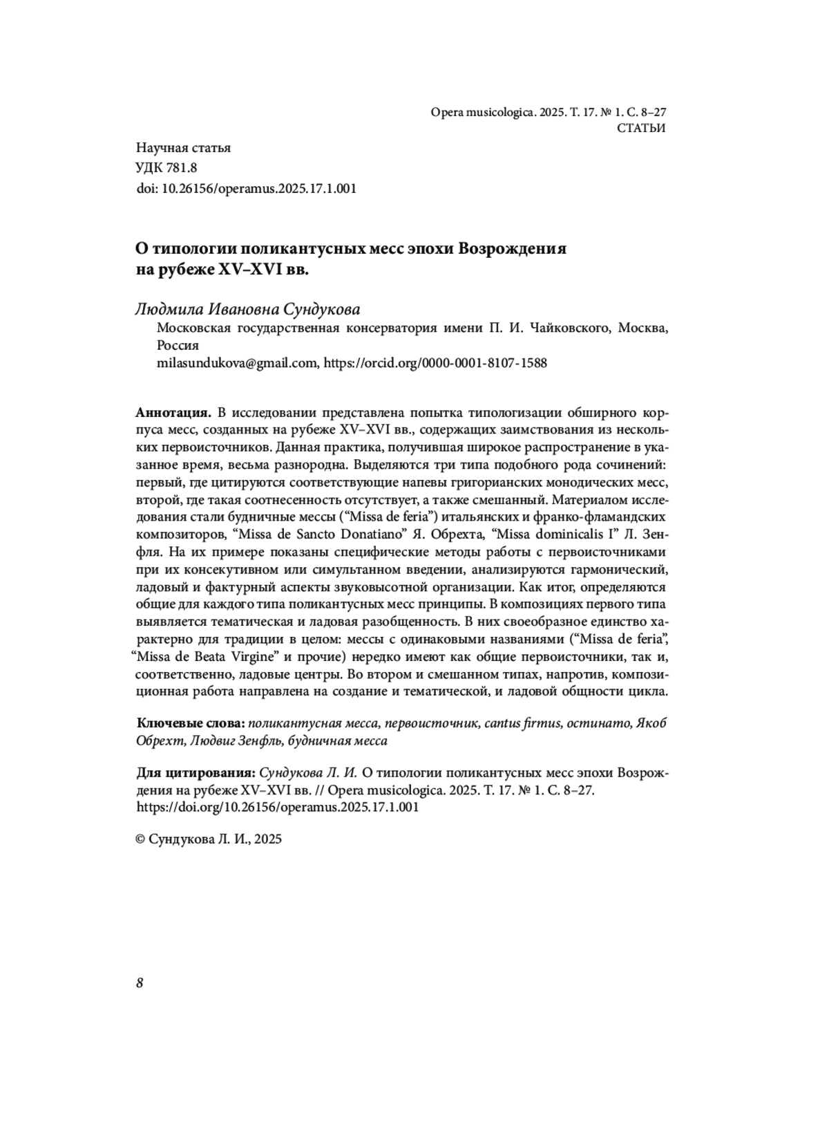 В исследовании представлена попытка типологизации обширного корпуса месс, созданных на рубеже XV-XVI вв., содержащих заимствования из нескольких первоисточников. Данная практика, получившая широкое распространение в указанное время, весьма разнородна. Выделяются три типа подобного рода сочинений: первый, где цитируются соответствующие напевы григорианских монодических месс, второй, где такая соотнесенность отсутствует, а также смешанный. Материалом исследования стали будничные мессы (“Missa de feria”) итальянских и франко-фламандских композиторов, “Missa de Sancto Donatiano” Я. Обрехта, “Missa dominicalis I” Л. Зенфля. На их примере показаны специфические методы работы с первоисточниками при их консекутивном или симультанном введении, анализируются гармонический, ладовый и фактурный аспекты звуковысотной организации. Как итог, определяются общие для каждого типа поликантусных месс принципы. В композициях первого типа выявляется тематическая и ладовая разобщенность. В них своеобразное единство характерно для традиции в целом: мессы с одинаковыми названиями (“Missa de feria”, “Missa de Beata Virgine” и прочие) нередко имеют как общие первоисточники, так и, соответственно, ладовые центры. Во втором и смешанном типах, напротив, композиционная работа направлена на создание и тематической, и ладовой общности цикла.