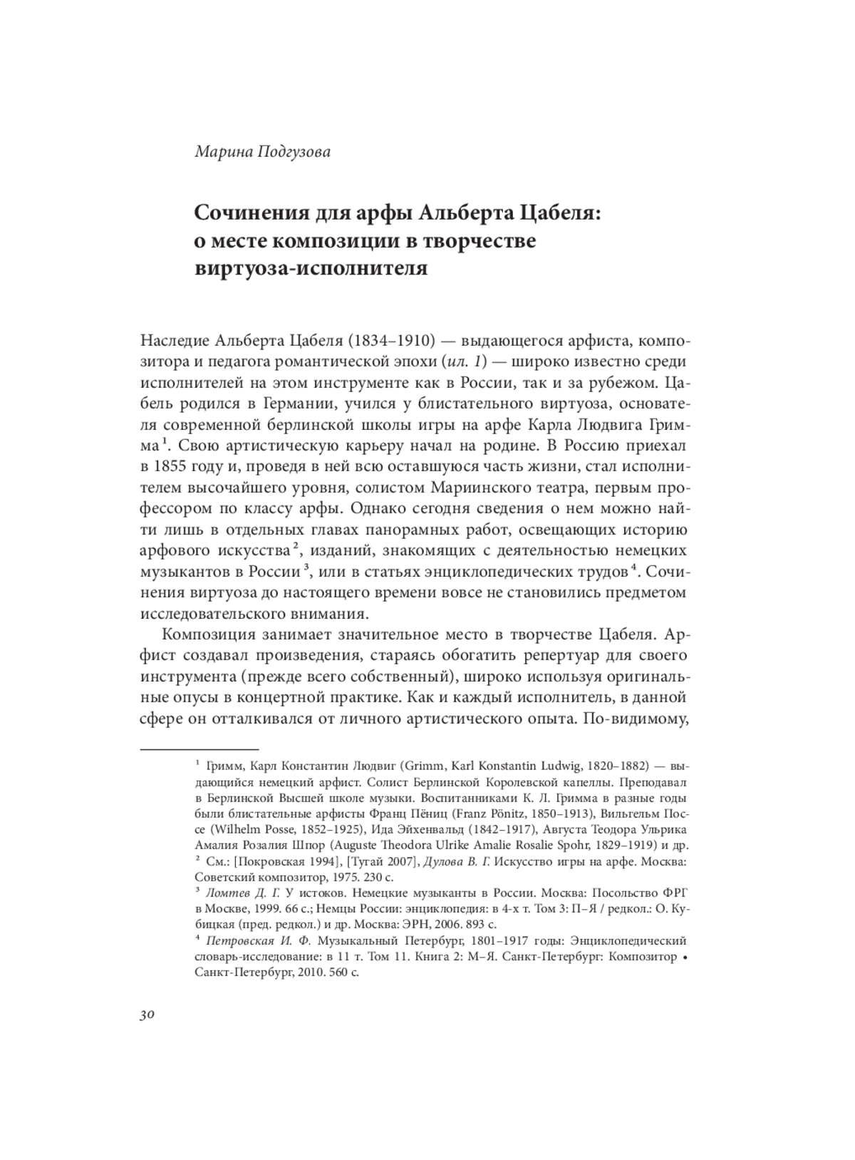 В статье рассматривается композиторское творчество выдающегося арфиста, стоявшего у истоков становления отечественной традиции игры на инструменте, Альберта Цабеля (1834-1910). Концертирующий виртуоз, солист оркестра Мариинского театра, первый профессор по классу арфы в России, он создавал произведения для своего инструмента. До настоящего времени личности Цабеля были посвящены лишь небольшие очерки в работах панорамного характера. Наследие арфиста ранее вовсе не изучалось. В публикации впервые рассмотрены миниатюры, созданные виртуозом, сделан вывод об их связи с романтическим направлением. Проанализирован первый в России Концерт для арфы с оркестром c-moll ор. 35, ставший заключительным «аккордом» в композиторском творчестве Цабеля. Исполнитель, не имевший себе равных на российской земле в техническом мастерстве, оставил сочинение, и в наши дни доступное лишь профессионалам. Концерт объединил в себе стилевые черты классицизма и романтизма и, кроме того, воплотил укоренившиеся в Европе XIX столетия каноны в создании сочинений для арфы. Виртуозность, фактурное разнообразие, тембровая выразительность и, вместе с тем, отсутствие содержательного художественного начала дают основания причислить произведение к музыке второго плана. Опус удостоился весьма неоднозначной рецензии Ц. А. Кюи, однако, созданный выдающимся исполнителем с великолепным знанием инструмента, Концерт и сегодня востребован арфистами во всем мире. В результате исследования делается вывод о том, что композиторское творчество Цабеля было подчинено более значительному исполнительскому таланту музыканта.