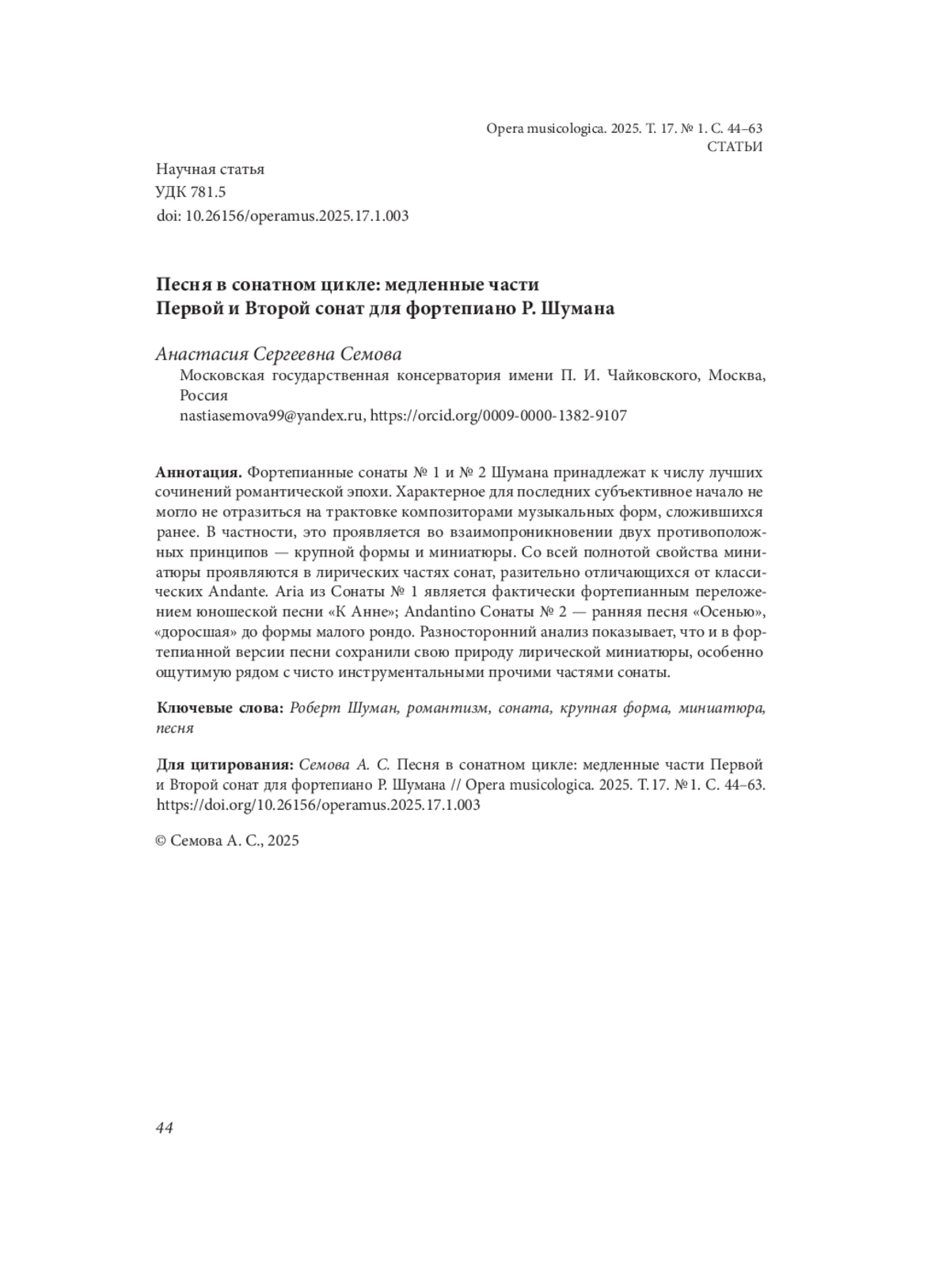 Фортепианные сонаты № 1 и № 2 Шумана принадлежат к числу лучших сочинений романтической эпохи. Характерное для последних субъективное начало не могло не отразиться на трактовке композиторами музыкальных форм, сложившихся ранее. В частности, это проявляется во взаимопроникновении двух противоположных принципов - крупной формы и миниатюры. Со всей полнотой свойства миниатюры проявляются в лирических частях сонат, разительно отличающихся от классических Andante. Aria из Сонаты № 1 является фактически фортепианным переложением юношеской песни «К Анне»; Andantino Сонаты № 2 - ранняя песня «Осенью», «доросшая» до формы малого рондо. Разносторонний анализ показывает, что и в фортепианной версии песни сохранили свою природу лирической миниатюры, особенно ощутимую рядом с чисто инструментальными прочими частями сонаты.