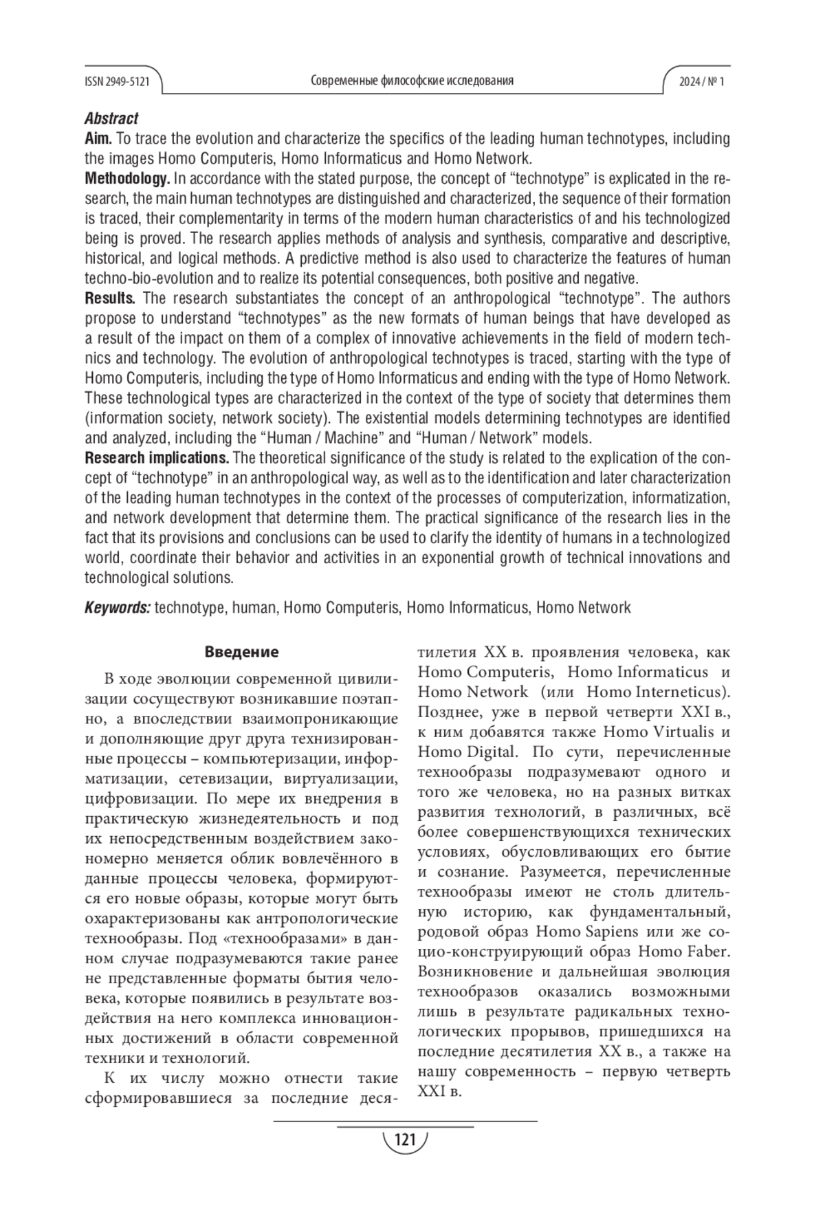 Результаты. В исследовании получает обоснование понятие антропологического «технообраза». Под «технообразами» авторы предлагают понимать новые форматы бытия человека, сложившиеся в результате воздействия на него комплекса инновационных достижений в области современной техники и технологий. Прослеживается эволюция антропологических технообразов, начиная с образа Homo Computeris, включая образ Homo Informaticus и завершаясь образом Homo Network. Указанные технообразы характеризуются в контексте определяющего их типа социума (информационное общество, сетевое общество). Выделяются и анализируются экзистенциальные модели, лежащие в основании технообразов, в том числе модель «Человек / Машина» и «Человек / Сеть». Теоретическая и/или практическая значимость.