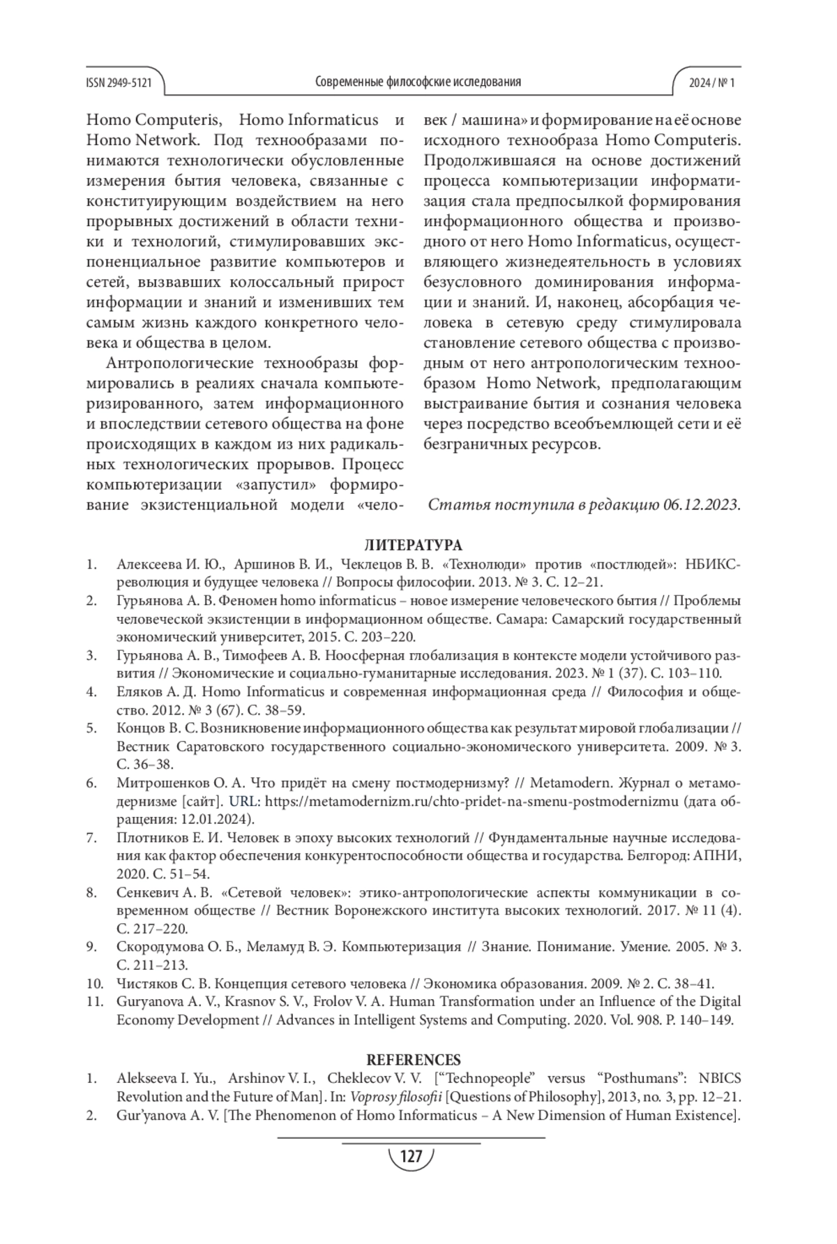 2. Гурьянова А. В. Феномен homo informaticus - новое измерение человеческого бытия // Проблемы человеческой экзистенции в информационном обществе. Самара: Самарский государственный экономический университет, 2015. С. 203-220.