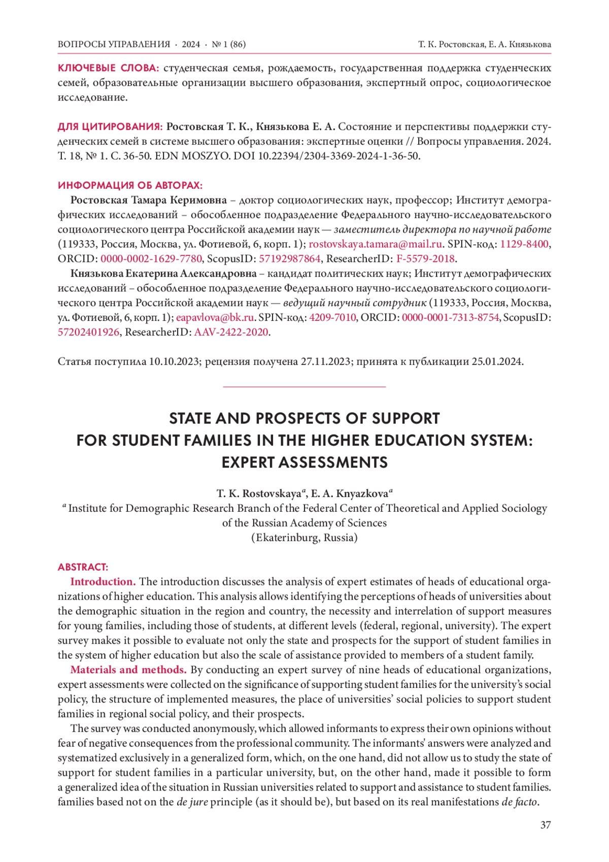 Введение. В статье приводится анализ экспертных оценок руководителей образовательных организаций высшего образования, позволяющий выявить представления руководства вузов о демографической ситуации в стране и регионе, необходимости и взаимосвязи мер поддержки молодых семей, в том числе студенческих, на различных уровнях (федеральном, региональном, вузовском). Экспертный опрос дал возможность оценить не только состояние и перспективы поддержки студенческих семей в системе высшего образования, но и масштабы оказываемой помощи членам студенческой семьи.