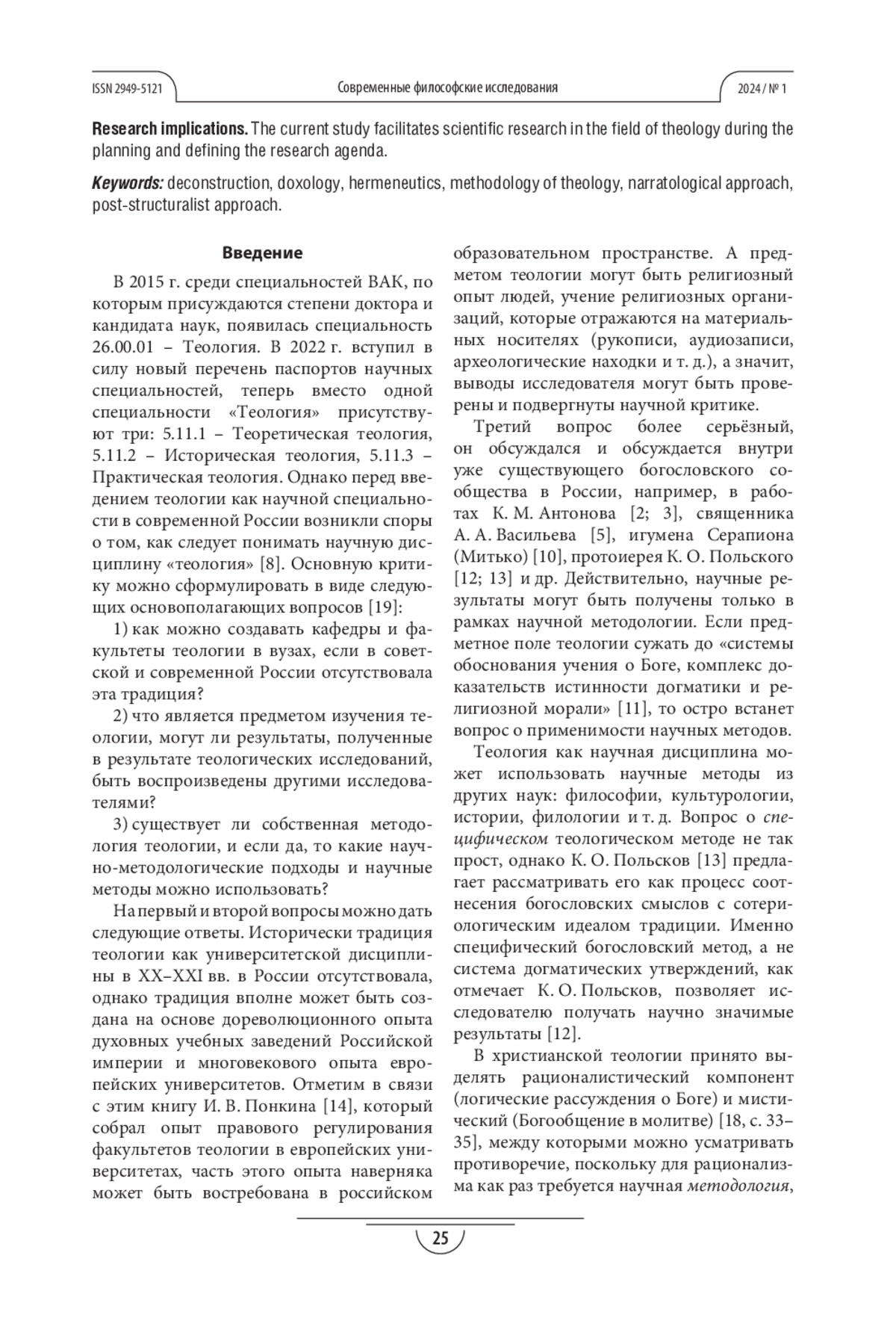 12. Польсков К. О. К вопросу о научном богословском методе // Вопросы философии. 2010. № 7. С. 93-101.