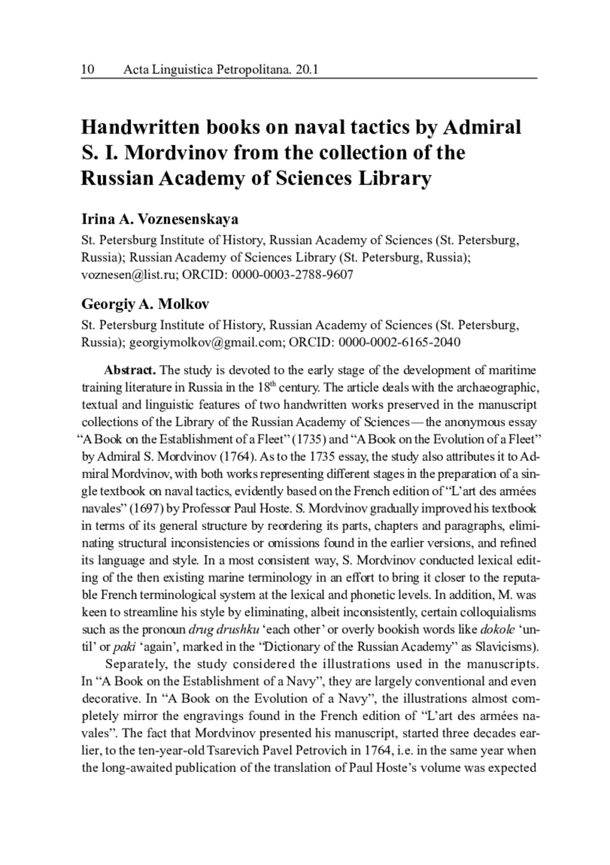 Исследование посвящено раннему этапу формирования учебной литературы по морскому делу в России в XVIII в. В статье рассмотрены археографические, текстологические и языковые особенности двух рукописных сочинений, сохранившихся в рукописных собраниях БАН — «Книги о учреждении флота» (1735 г.) и «Книги о эволюции флота» (1764 г.), написанной адмиралом С. И. Мордвиновым. В исследовании сочинение 1735 г. также атрибутируется адмиралу Мордвинову, при этом оба текста представляют собой разные этапы подготовки учебного пособия по морской тактике, основанного в конечном счете на французском издании «L’art des armées navales» (1697 г.) профессора Поля Госта. С. И. Мордвинов постепенно улучшает свое учебное пособие на уровне общей структуры, упорядочивая систему частей, глав и параграфов, устраняя структурные недочеты и пропуски раннего сочинения, и работает над его языком.