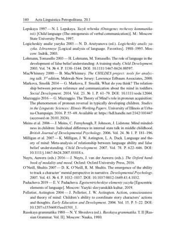 - Markova, Smolik 2014 — G. Markova, F. Smolik. What do you think? The relationship between person reference and communication about the mind in toddlers // Social Development. 2014. Vol. 23. № 1. P. 61–79. DOI: 10.1111/sode.12044.