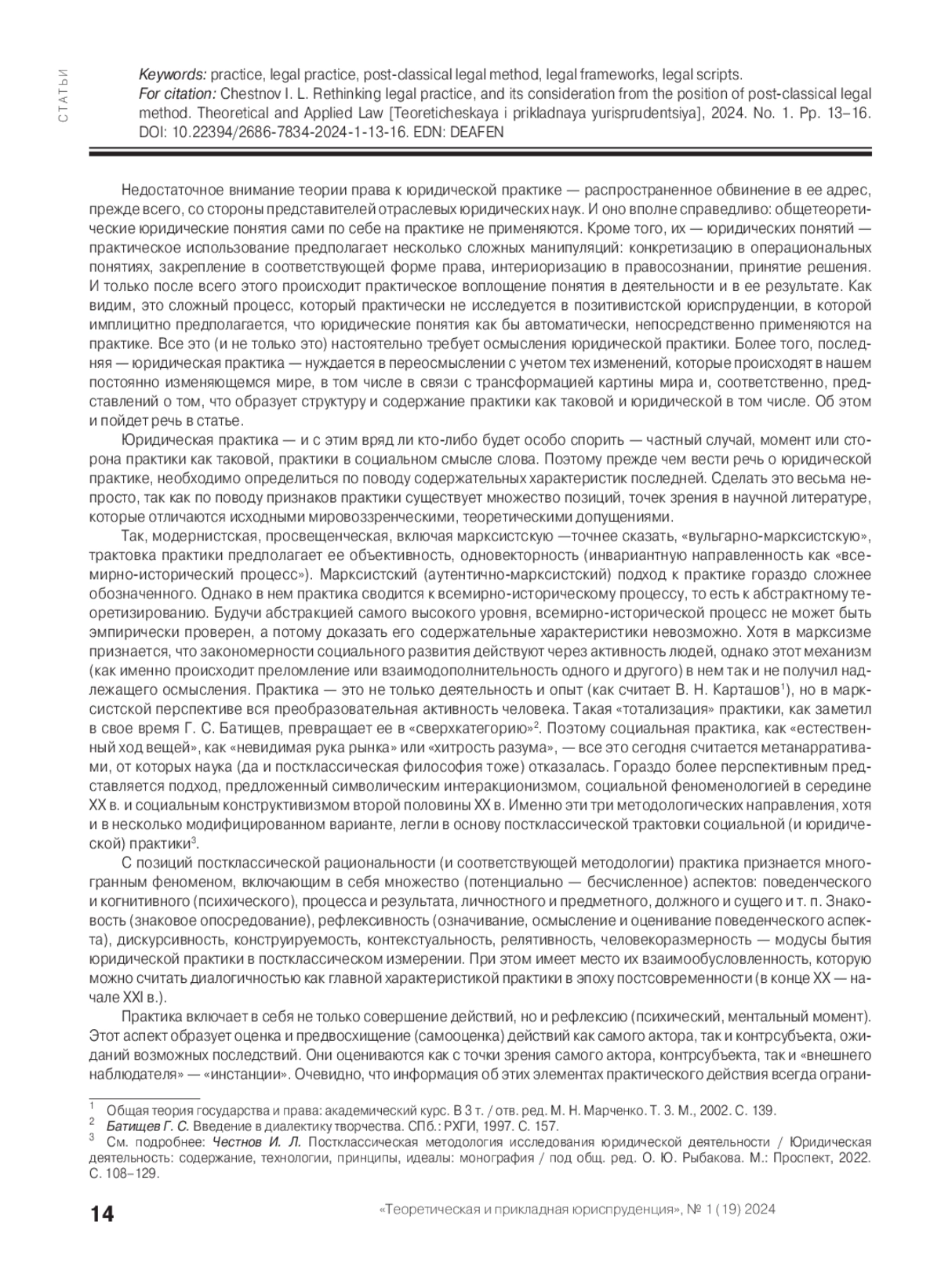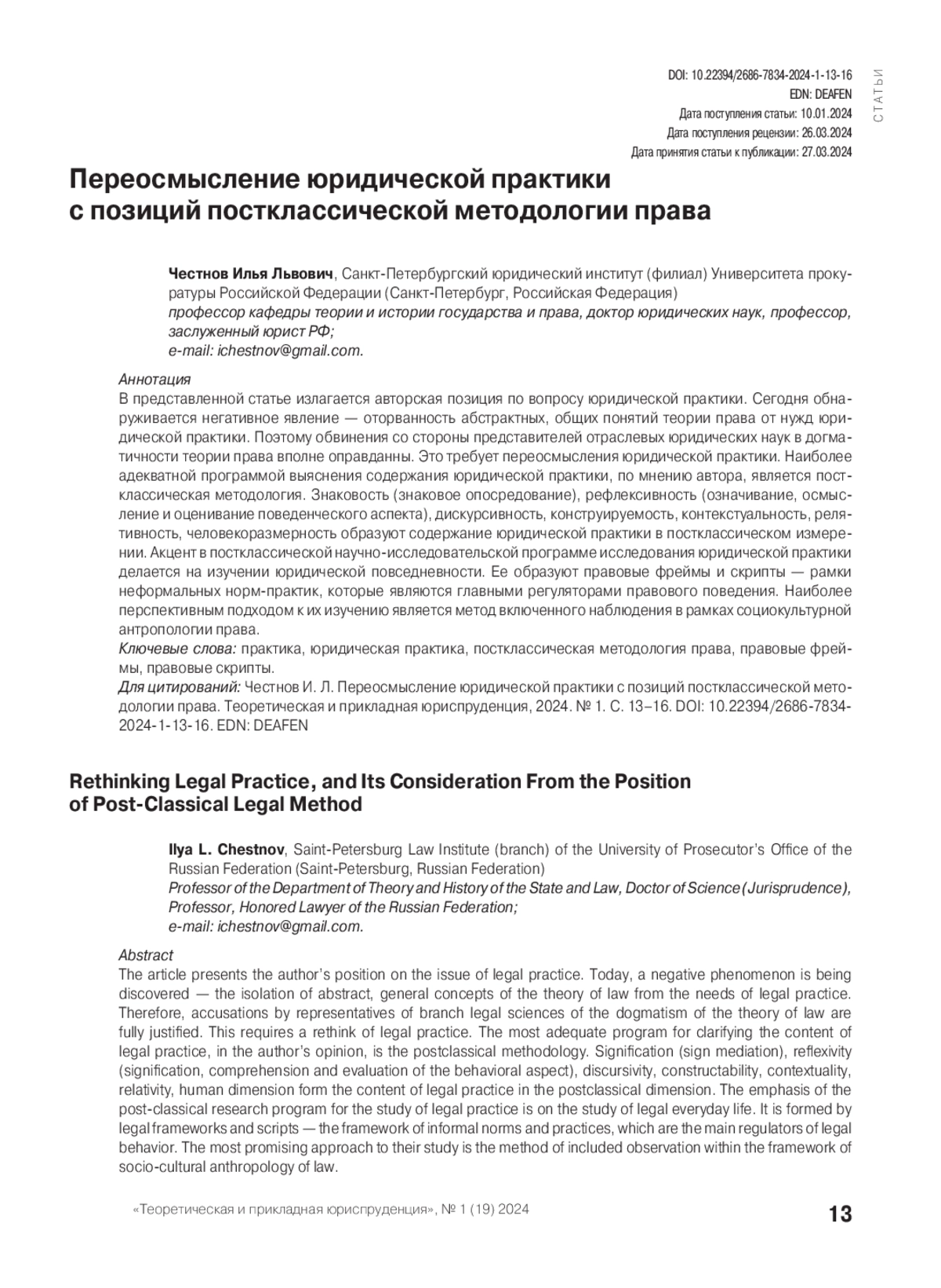 3. Честнов И. Л . Постклассическая методология исследования юридической деятельности / Юридическая деятельность: содержание, технологии, принципы, идеалы: монография / под общ. ред. О. Ю. Рыбакова. М.: Проспект, 2022. С. 108-129.