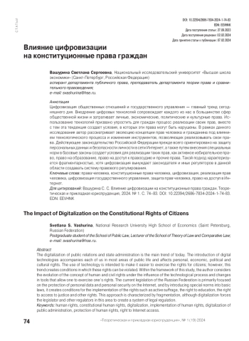 Цифровизация общественных отношений и государственного управления — главный тренд сегодняшнего дня. Внедрение цифровых технологий сопровождает каждого из нас в большинстве сфер общественной жизни и затрагивает личные, экономические, политические и культурные права. Использование технологий призвано упростить для граждан процесс реализации своих прав, вместе с тем эта тенденция создает условия, в которых эти права могут быть нарушены. В рамках данного исследования автор рассматривает эволюцию концепции прав человека и гражданина под влиянием технологического процесса и изменения инструментов, позволяющих реализовывать свои права. Действующее законодательство Российской Федерации прежде всего ориентировано на защиту персональных данных и безопасности личности в сети Интернет, а также путем внесения специальных норм в базовые законы создает условия для реализации таких прав, как активное избирательное право, право на образование, право на доступ к правосудию и прочие права. Такой подход характеризуется фрагментарностью, хотя цифровизация вынуждает законодателя и иных регуляторов в данной области создавать систему правового регулирования.