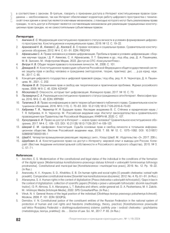 1. Аничкин Е. С. Модернизация конституционно-правового статуса личности в условиях формирования цифрового пространства. Конституционное и муниципальное право, 2019. № 12. С. 19-22.
