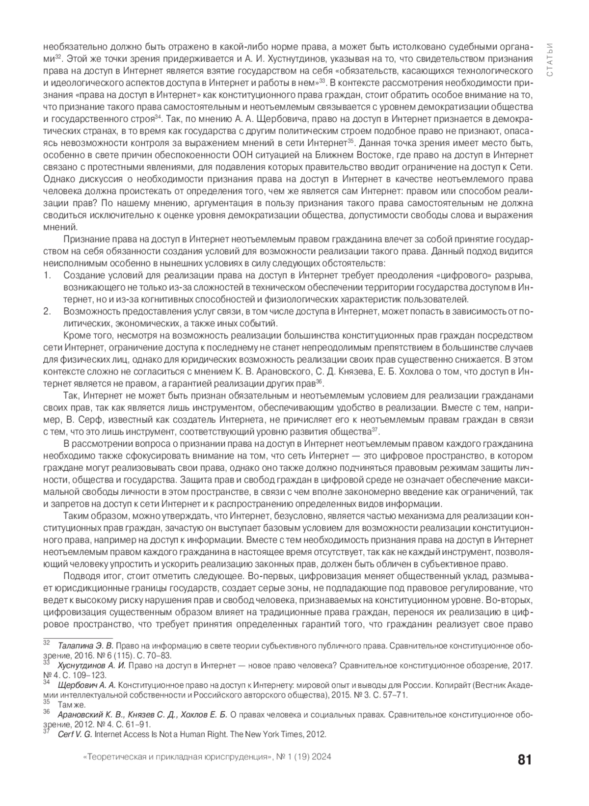 12. Хуснутдинов А. И. Право на доступ в Интернет - новое право человека? Сравнительное конституционное обозрение, 2017. № 4. С. 109-123. https://doi.org/10.21128/1812-7126-2017-4-109-123