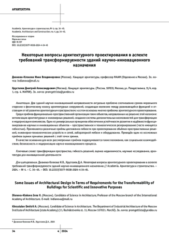 Статья: Некоторые вопросы архитектурного проектирования в аспекте требований трансформируемости зданий научно-инновационного назначения (2024)