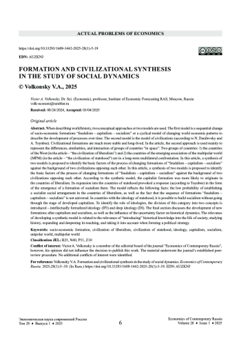 При описании мировой истории используются два концептуальных подхода, или две модели. Первая модель - последовательная смена общественно-экономических формаций «феодализм - капитализм - социализм», или циклическая модель смены мирохозяйственных укладов, для описания развития процессов во времени. Вторая модель - модель цивилизаций (по Н. Данилевскому и А. Тойнби). Цивилизационные образования - гораздо более стабильные и долго живущие. В статье второй подход используется в основном для представления различий, сходства, взаимодействия групп стран в пространстве. Две группы стран: 1) страны запада (в статье - «цивилизация либерализма») и 2) страны формирующейся ассоциации многополярного мира (МПМ) (в статье - «цивилизация государственности») - находятся в долгосрочном многостороннем противостоянии. В настоящей статье предложен синтез двух подходов (синтетическая модель) для выявления базовых факторов процесса смены формаций «феодализм - капитализм - социализм» на фоне противостоящих друг другу двух цивилизаций. Согласно синтетической модели, капиталистическая формация с большей вероятностью могла зародиться именно в странах либерализма. Ее экспансия в страны с идеологией государственности вызвала ответ (по Тойнби) в виде возникновения там формации социализма. Модель отражает следующие факты: низкую вероятность установления социалистического общественного устройства в странах либерализма, а также тот факт, что последовательность формаций «феодализм - капитализм - социализм» не является универсальной. В странах с идеологией государственности возможно строительство социализма без прохождения стадии развитого капитализма. Для выявления роли идеологий вводится разделение этой категории на два понятия: интеллектуально формализованная идеология (ИФИ) и глубинная идеология (ГИ). В заключительном разделе обсуждаются вопрос о развитии новых формаций после капитализма и социализма, а также влияние фактора неопределенности на историческую динамику. Актуальность разработки синтетической модели связана с актуальностью внедрения исторических знаний в жизнь общества, изучения истории, расширения и углубления ее преподавания, учета при формировании политической стратегии.
