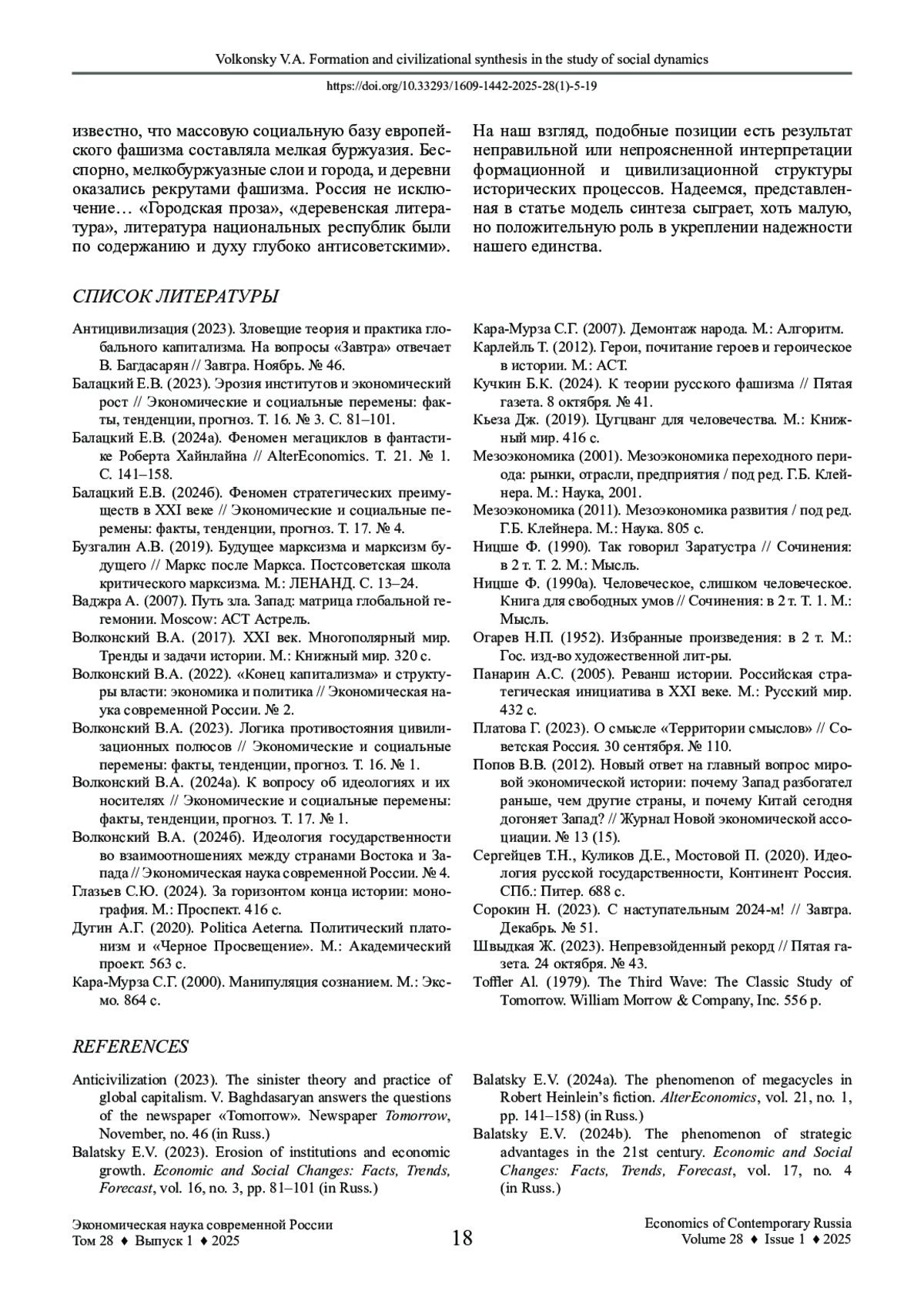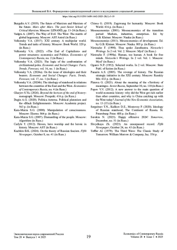 9. Волконский В.А. (2023). Логика противостояния цивилизационных полюсов // Экономические и социальные перемены: факты, тенденции, прогноз. Т. 16. № 1.