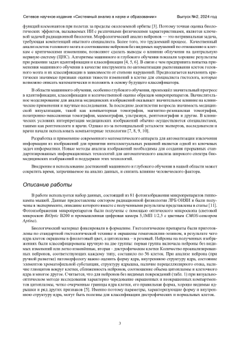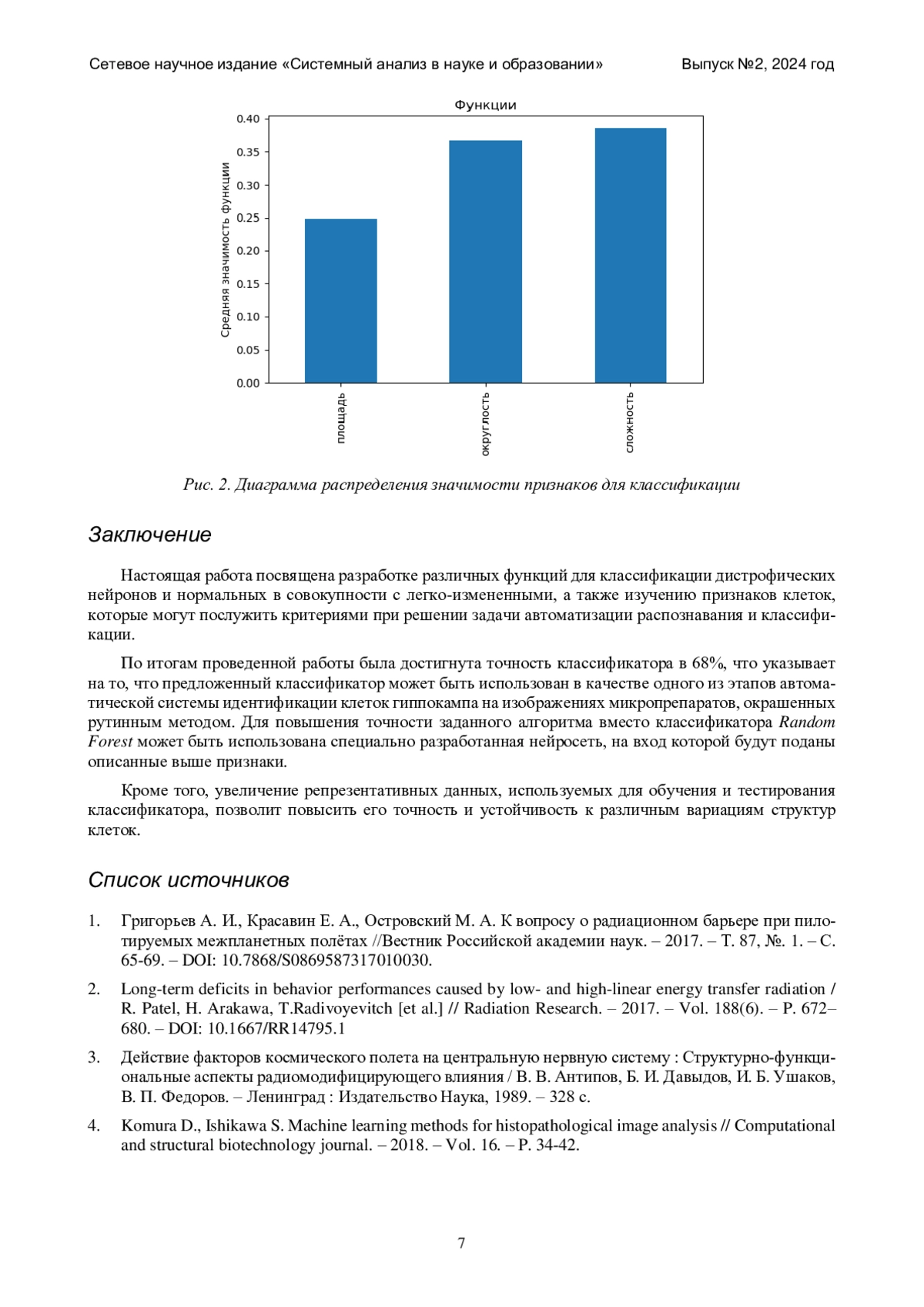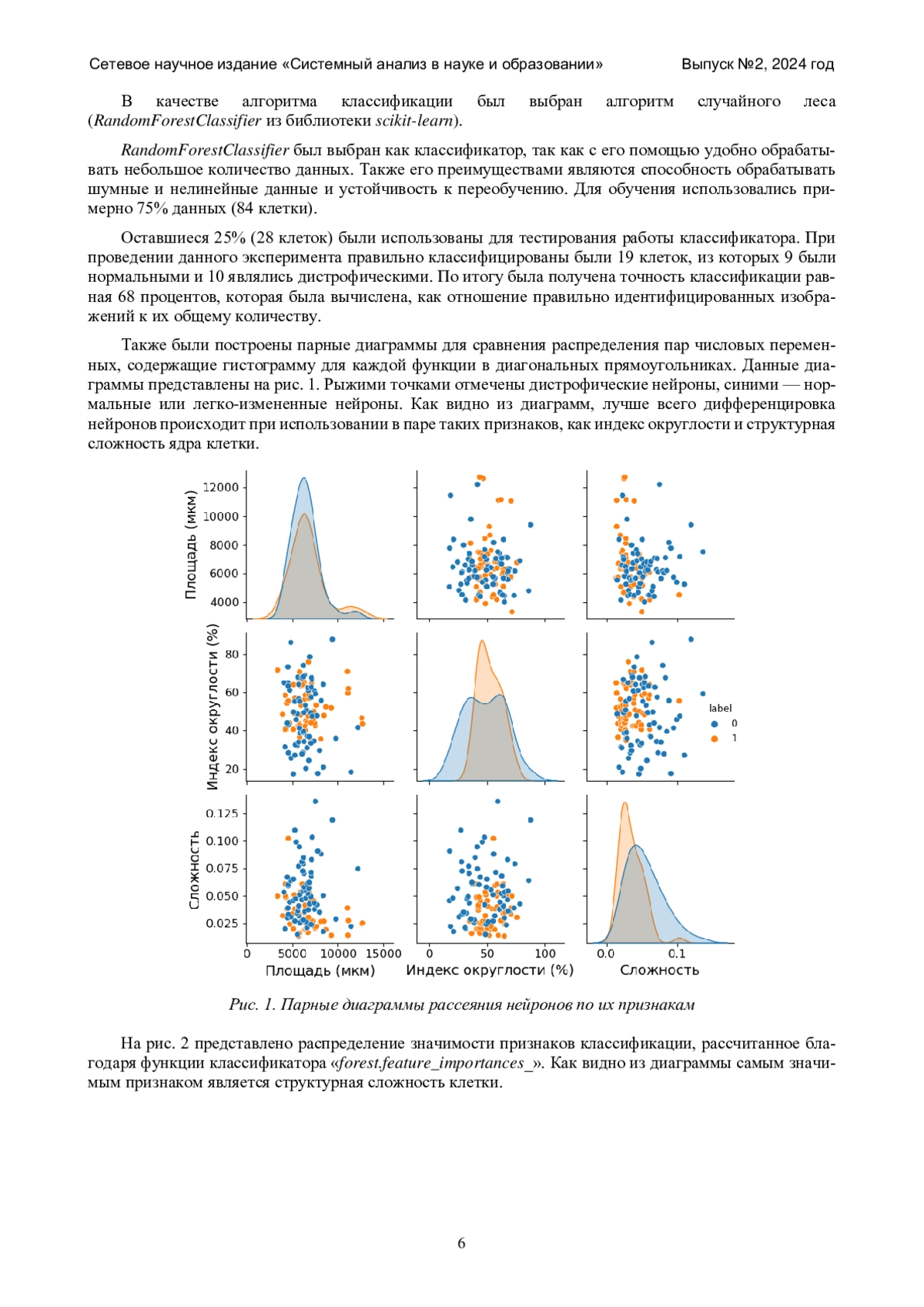 Автоматическая идентификация и классификация нейронов в микропрепаратах нервной ткани имеет важное значение при изучении воздействия ионизирующего излучения на головной мозг. Оценка состояния клеток ЦНС специалистом вручную является трудоемким и субъективным процессом, в то время как алгоритмы машинного обучения показали потенциал в автоматизации этой задачи. В данной работе были использованы 81 фотоизображение препаратов гиппокампа мышей, на которых выделяли клетки без видимых повреждений, легко-измененные и дистрофические. Для каждой клетки вычислялись следующие параметры: Площадь, Округлость и Структурная сложность ядра. Данные параметры использовались для обучения классификатора RandomForestClassifier с использованием библиотеки scikit learn. Точность классификации составила 68%, при этом наиболее значимым признаком оказалась структурная сложность ядра. Предложенный классификатор может служить основой для автоматической системы анализа нейронов в микропрепаратах головного мозга.