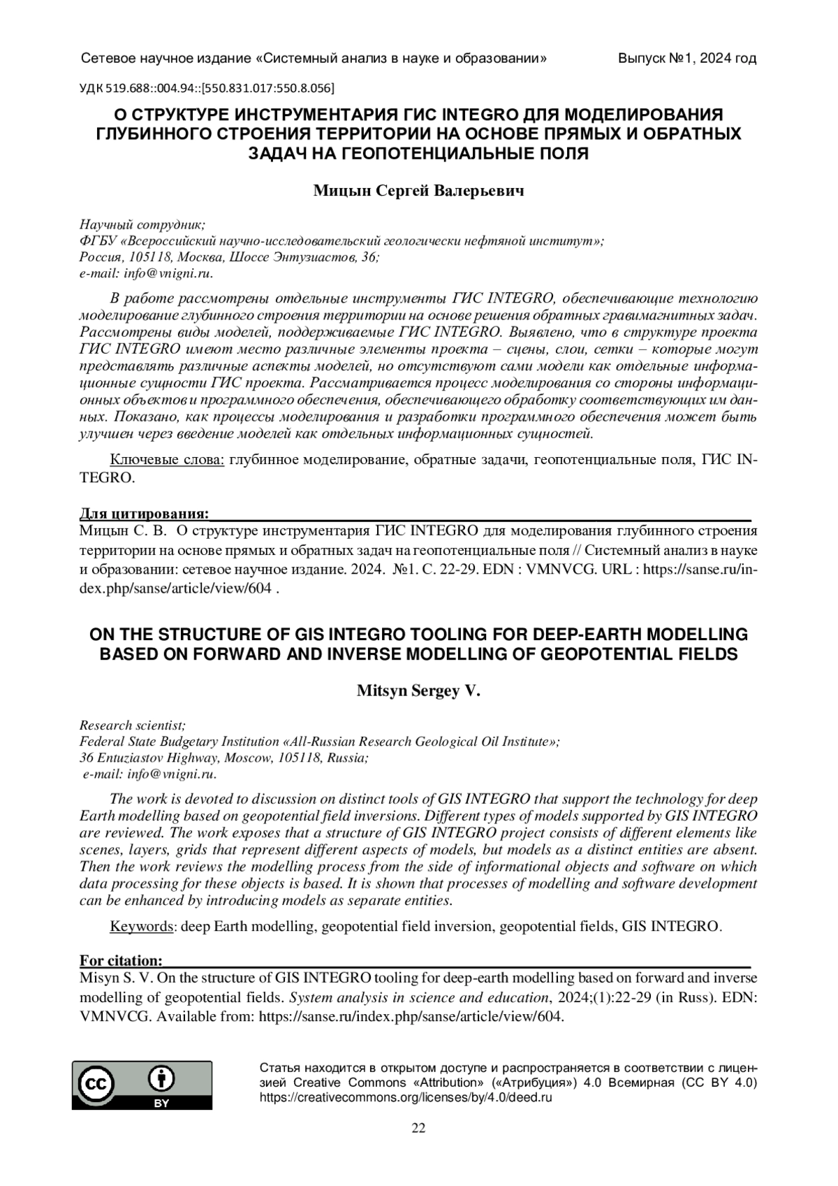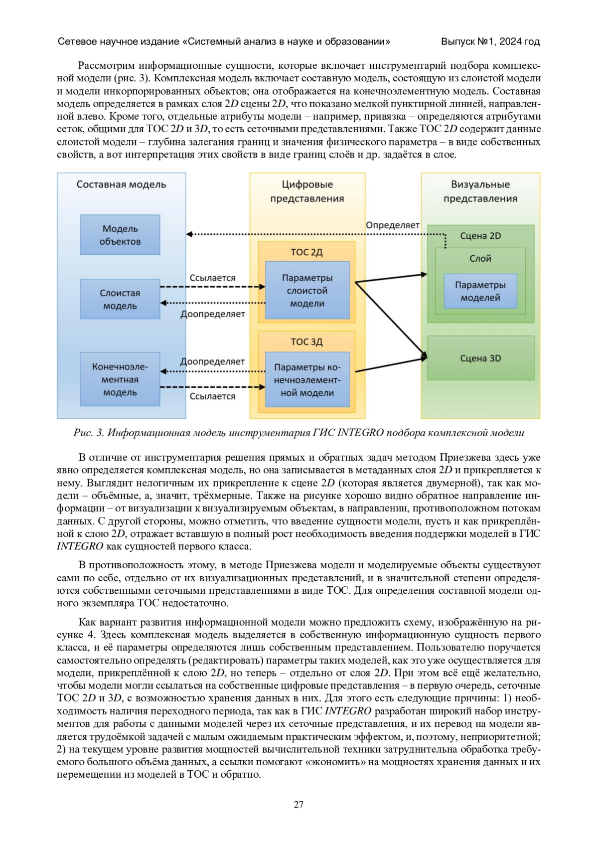В работе рассмотрены отдельные инструменты ГИС INTEGRO, обеспечивающие технологию моделирование глубинного строения территории на основе решения обратных гравимагнитных задач. Рассмотрены виды моделей, поддерживаемые ГИС INTEGRO. Выявлено, что в структуре проекта ГИС INTEGRO имеют место различные элементы проекта - сцены, слои, сетки - которые могут представлять различные аспекты моделей, но отсутствуют сами модели как отдельные информационные сущности ГИС проекта. Рассматривается процесс моделирования со стороны информационных объектов и программного обеспечения, обеспечивающего обработку соответствующих им данных. Показано, как процессы моделирования и разработки программного обеспечения может быть улучшен через введение моделей как отдельных информационных сущностей.