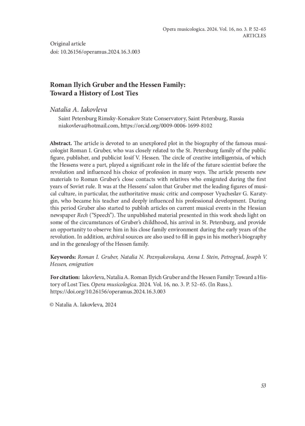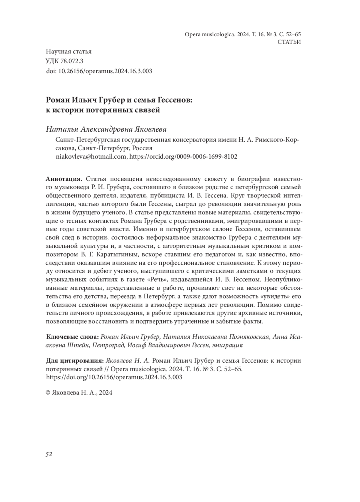 Статья посвящена неисследованному сюжету в биографии известного музыковеда Р. И. Грубера, состоявшего в близком родстве с петербургской семьей общественного деятеля, издателя, публициста И. В. Гессена. Круг творческой интеллигенции, частью которого были Гессены, сыграл до революции значительную роль в жизни будущего ученого. В статье представлены новые материалы, свидетельствующие о тесных контактах Романа Грубера с родственниками, эмигрировавшими в первые годы советской власти. Именно в петербургском салоне Гессенов, оставившем свой след в истории, состоялось неформальное знакомство Грубера с деятелями музыкальной культуры и, в частности, с авторитетным музыкальным критиком и композитором В. Г. Каратыгиным, вскоре ставшим его педагогом и, как известно, впоследствии оказавшим влияние на его профессиональное становление. К этому периоду относится и дебют ученого, выступившего с критическими заметками о текущих музыкальных событиях в газете «Речь», издававшейся И. В. Гессеном. Неопубликованные материалы, представленные в работе, проливают свет на некоторые обстоятельства его детства, переезда в Петербург, а также дают возможность «увидеть» его в близком семейном окружении в атмосфере первых лет революции. Помимо свидетельств личного происхождения, в работе привлекаются другие архивные источники, позволяющие восстановить и подтвердить утраченные и забытые факты.