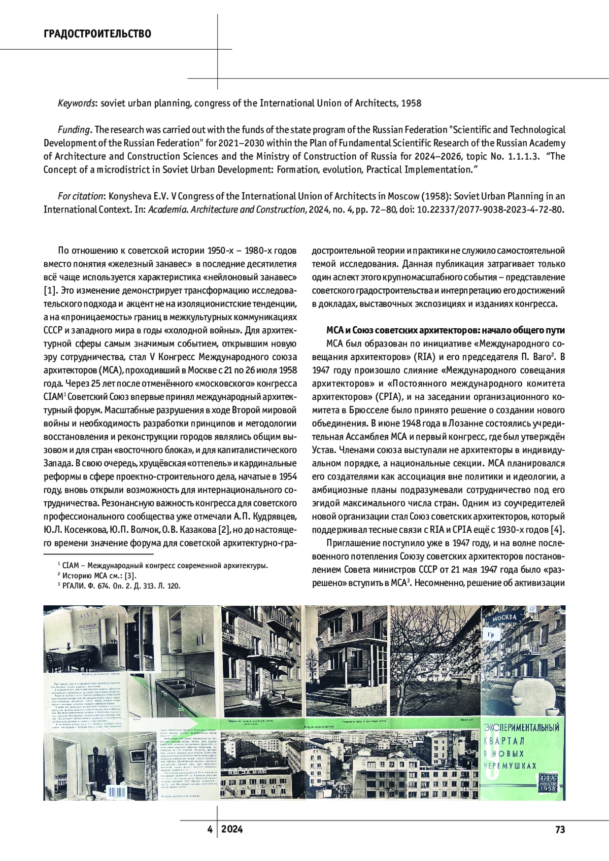 По отношению к советской истории 1950-х – 1980-х годов вместо понятия «железный занавес» в последние десятилетия всё чаще используется характеристика «нейлоновый занавес» [1]. Это изменение демонстрирует трансформацию исследовательского подхода и акцент не на изоляционистские тенденции, а на «проницаемость» границ в межкультурных коммуникациях СССР и западного мира в годы «холодной войны». Для архитектурной сферы самым значимым событием, открывшим новую эру сотрудничества, стал V Конгресс Международного союза архитекторов (МСА), проходивший в Москве с 21 по 26 июля 1958 года. Через 25 лет после отменённого «московского» конгресса CIAM1 Советский Союз впервые принял международный архитектурный форум. Масштабные разрушения в ходе Второй мировой войны и необходимость разработки принципов и методологии восстановления и реконструкции городов являлись общим вызовом и для стран «восточного блока», и для капиталистического Запада. В свою очередь, хрущёвская «оттепель» и кардинальные реформы в сфере проектно-строительного дела, начатые в 1954 году, вновь открыли возможность для интернационального сотрудничества. Резонансную важность конгресса для советского профессионального сообщества уже отмечали А. П. Кудрявцев, Ю. Л. Косенкова, Ю. П. Волчок, О. В. Казакова [2], но до настоящего времени значение форума для советской архитектурно-градостроительной теории и практики не служило самостоятельной темой исследования. Данная публикация затрагивает только один аспект этого крупномасштабного события – представление советского градостроительства и интерпретацию его достижений в докладах, выставочных экспозициях и изданиях конгресса.
