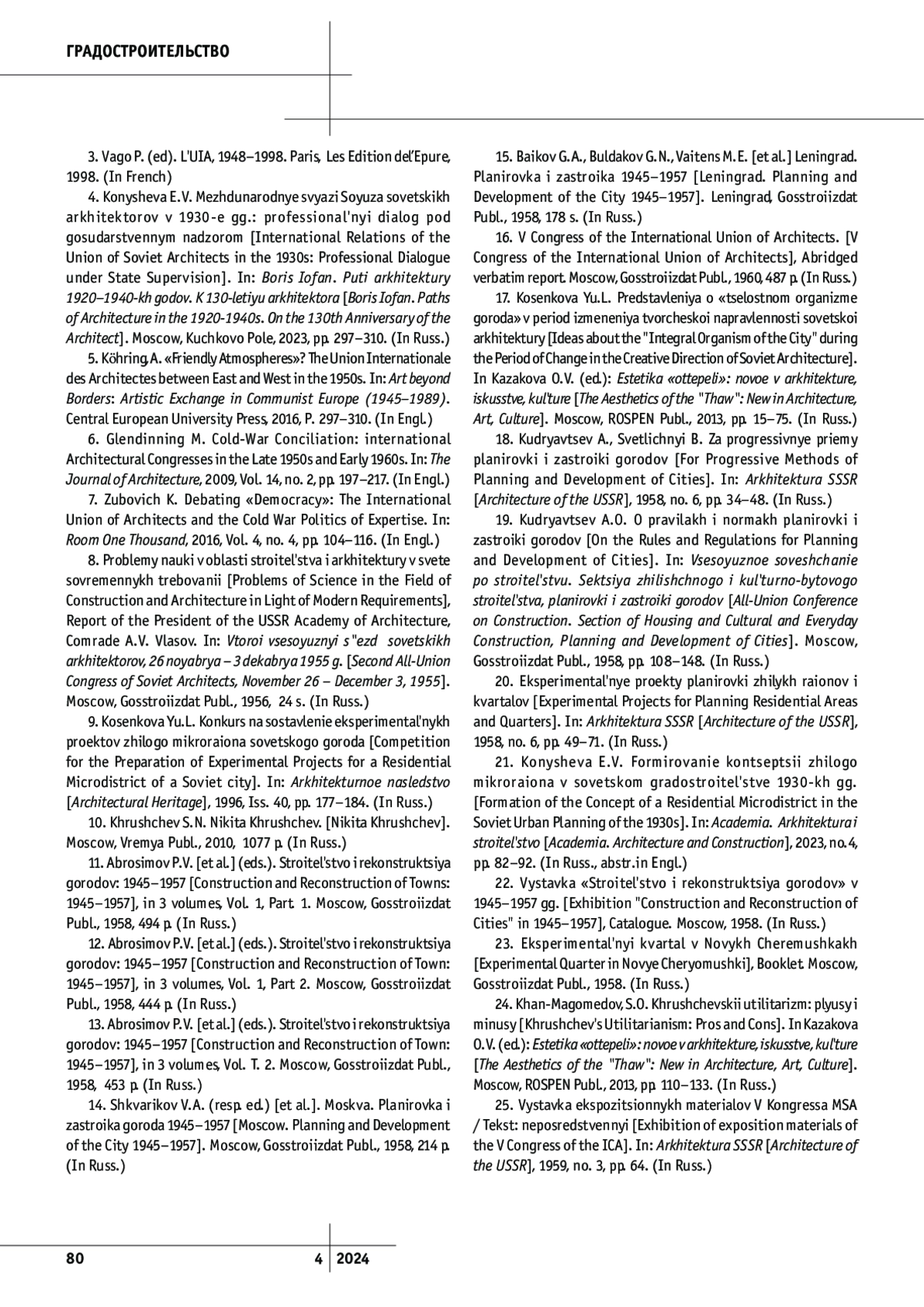 4. Конышева, Е.В. Международные связи Союза советских архитекторов в 1930-е гг.: профессиональный диалог под государственным надзором / Е.В. Конышева. – Текст : непосредственный // Борис Иофан. Пути архитектуры 1920–1940-х годов. К 130-летию архитектора. – Москва : Кучково Поле, 2023. – С. 297–310.