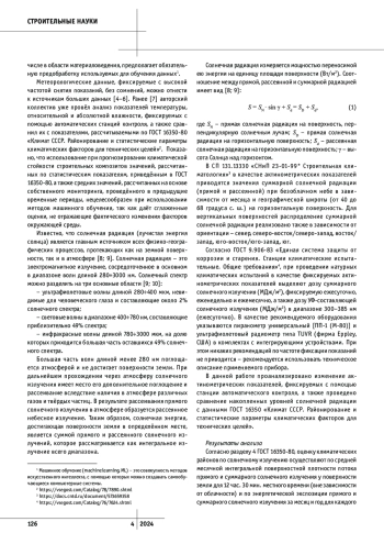 В статье приведены результаты анализа актинометрических показателей, в частности, интенсивности солнечной радиации и ультрафиолетовых излучений диапазонов A и B. Рассмотрено распределение актинометрических показателей в зависимости от дня, месяца и года (2015–2022) для умеренно континентального климата (г. Саранск). Проведено сравнение рассчитанных значений суммарной солнечной радиации, полученных с помощью станции автоматического контроля, а также показателей, представленных в ГОСТ 16350-80 для умеренного климатического района (г. Москва). Проведён анализ распределения интенсивности солнечной радиации в трёх вариантах: данные только за дневной период и гражданские сумерки (вариант 1); данные без учёта ночного периода (вариант 2); все фиксируемые с частотой в 10 мин. показатели. Установлено, что несмотря на значительную протяжённость ночного и сумеречных периодов, среднее годовое снижение суммарной солнечной радиации составляет 1,3% (вариант 1) и 0,8% (вариант 2). Исходя из малых значений поправок актинометрических показателей, учитывающих продолжительность астрономических и гражданских сумерек, при разработке моделей машинного обучения принято решение использовать все фиксируемые с частотой в 10 мин. значения интенсивностей солнечной радиации и ультрафиолетовых излучений диапазонов A и B.