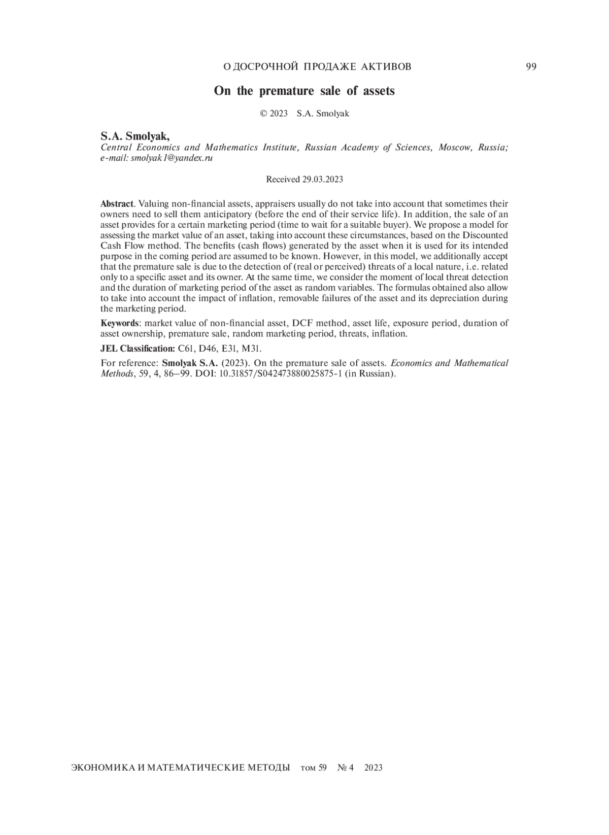5. Смоляк С.А. (2022). Новый метод оценки ликвидационной стоимости // Журнал Новой экономической ассоциации. № 3 (55). С. 12-27. EDN: VGOWNM