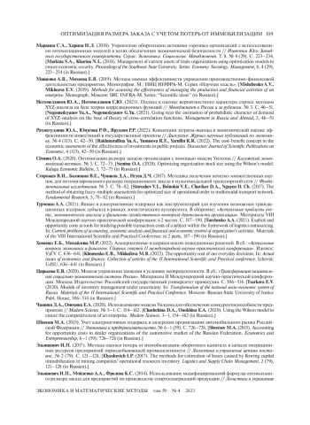 19. Царькова Е.В. (2020). Модели управления запасами в условиях неопределенности. В сб.: “Трансформация национальной социально-экономической системы России”. Материалы II Международной научно-практической конференции. Москва: Издательство: Российский государственный университет правосудия. С. 506-514. EDN: KXOOPN