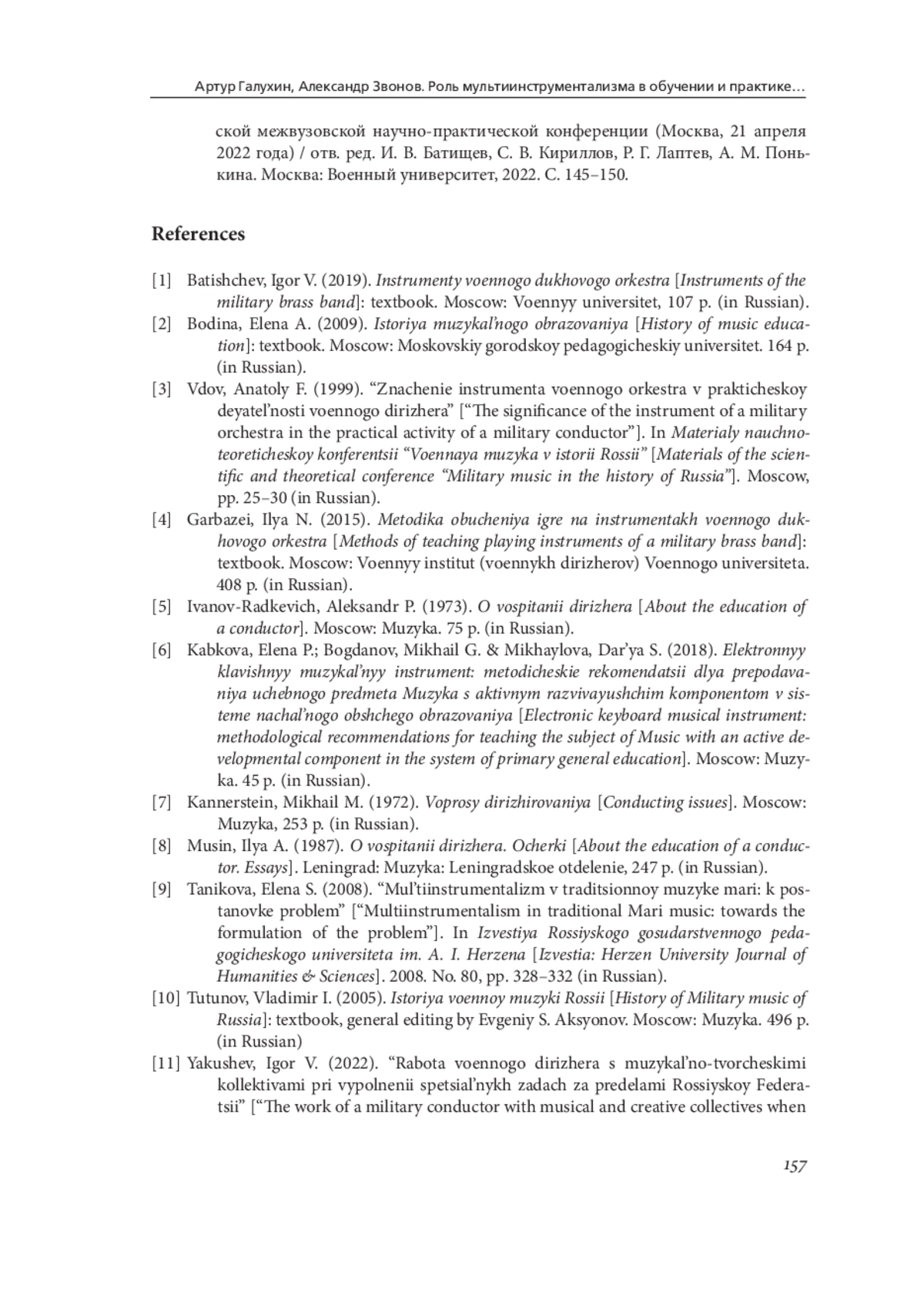 11. Якушев 2022 - Якушев И. В. Работа военного дирижера с музыкально-творческими коллективами при выполнении специальных задач за пределами Российской Федерации // Актуальные вопросы исполнительства и методики обучения игре на духовых и ударных инструментах: Материалы Всероссийской межвузовской научно-практической конференции (Москва, 21 апреля 2022 года) / отв. ред. И. В. Батищев, С. В. Кириллов, Р. Г. Лаптев, А. М. Понькина. Москва: Военный университет, 2022. C. 145-150.