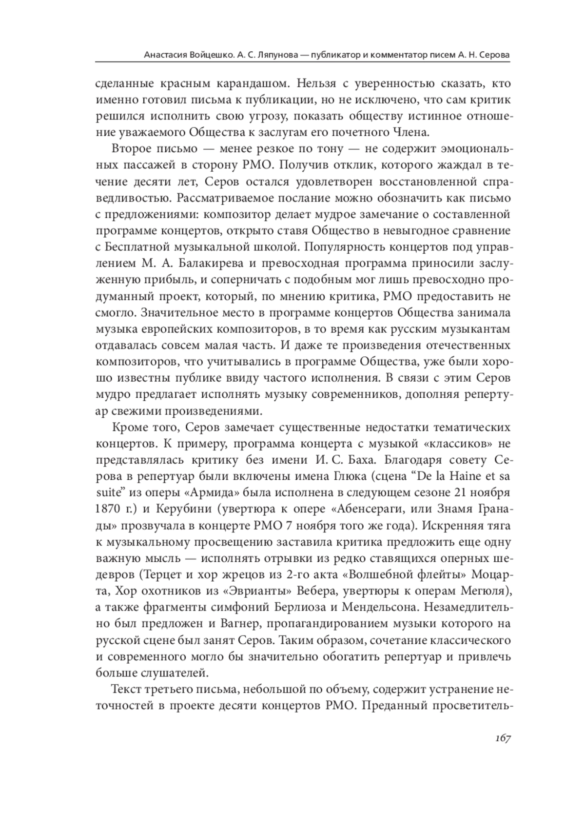 Письма А. Н. Серова к председателю Русского музыкального общества А. А. Кирееву, подготовленные к публикации заведующей Отделом рукописей Ленинградской консерватории А. С. Ляпуновой, раскрывают обстоятельства взаимоотношений композитора с Обществом и различными музыкантами: Даргомыжским, Балакиревым, Рубинштейном, Стасовым и др. В текстах писем содержится информация о составленных Серовым программах сезона 1870-1871 гг. (а также, частично, и 1869-1870). Предисловие («Заметка») Ляпуновой воссоздает контекст и устанавливает причины обращений композитора к адресату: не будучи привлечен к участию в Русском музыкальном обществе, Серов заявляет о своем отрицательном отношении к нему. Критике подвергались также концертные программы и их исполнение - в репертуаре концертов русской музыке отводилось слишком мало места. Привлечение Серова к составлению новых программ грядущих сезонов означала конец «десятилетней вражде», «полное примирение и сотрудничество враждующих сторон».