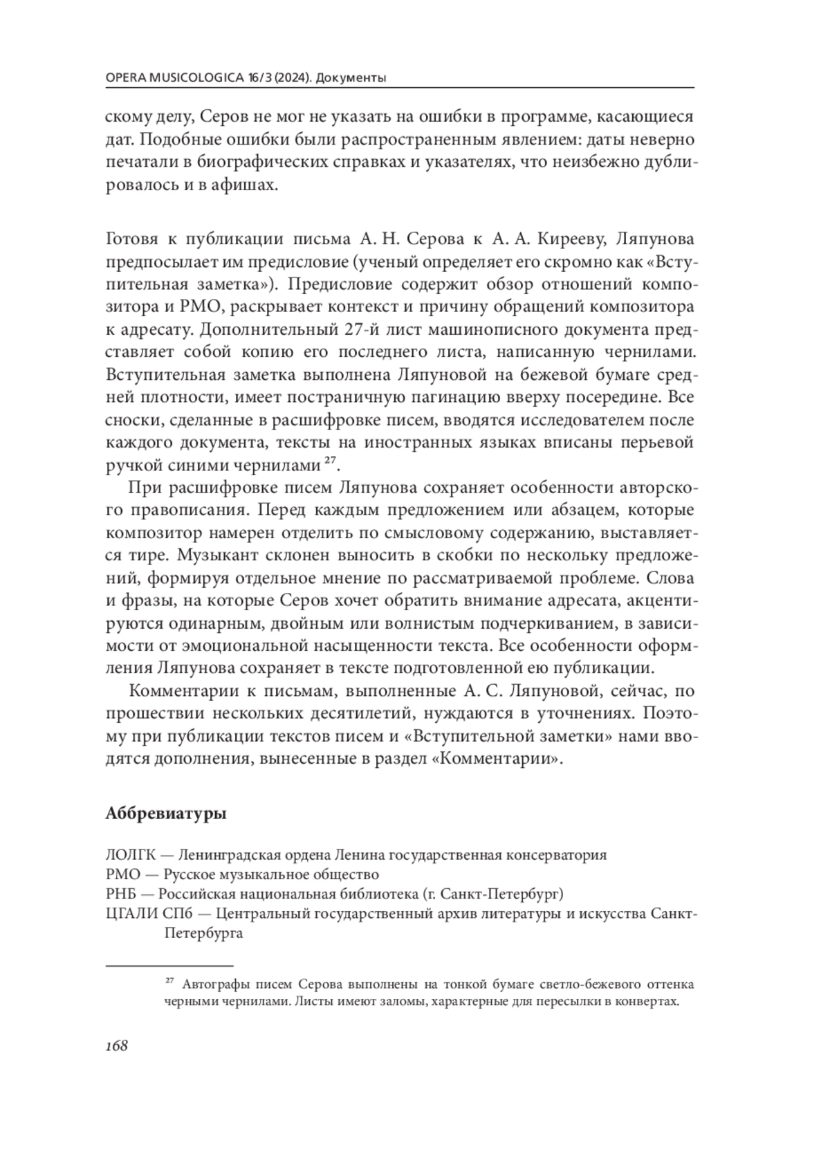 В 1940 г. известным отечественным источниковедом и текстологом, заведующей Отделом рукописей Ленинградской консерватории Анастасией Сергеевной Ляпуновой были подготовлены к публикации «три неизданных письма композитора А. Н. Серова к председателю Русского музыкального общества А. А. Кирееву» [Сквирская 2012, 1], которые хранятся в Научно-исследовательском отделе рукописей Научной музыкальной библиотеки Санкт-Петербургской консерватории.