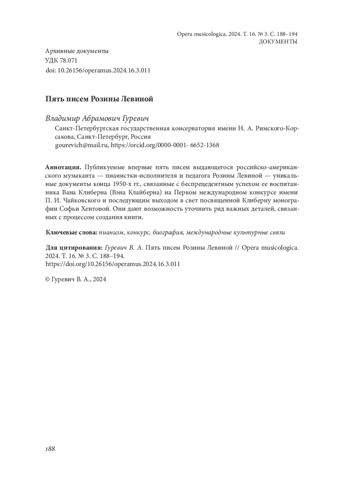 Пять писем Розины Яковлевны Левиной (1880–1976) — отголосок эпизода творческой биографии Софьи Михайловны Хентовой (1922–2002), который сделал ее известной всей стране: истории создания монографического очерка о Ване Клиберне (или Вэне Клайберне), чья феерическая победа на Первом международном конкурсе имени П. И. Чайковского в 1958 г. вызвала огромный интерес к личности замечательного музыканта.