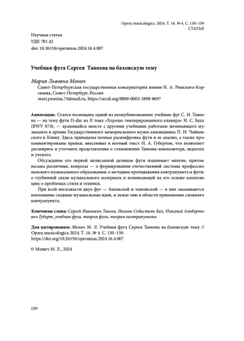 МОНИЧ М. Л. УЧЕБНАЯ ФУГА СЕРГЕЯ ТАНЕЕВА НА БАХОВСКУЮ ТЕМУ // OPERA MUSICOLOGICA. 2024. Т. 16 № 4