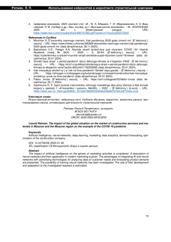 Технологии искусственного интеллекта (ИИ) проникают во все сферы жизнедеятельности человека. Сфера маркетинговой деятельности не стала исключением. Маркетинг – один из ключевых элементов успешного развития любого бизнеса, в том числе строительной компании. С появлением технологий искусственного интеллекта исследования рынка и прогнозирование потребностей клиентов стали более точными и эффективными. Возможности искусственного интеллекта оперативно и точно проводить динамический анализ таких ключевых факторов, как потребительское поведение, уровень дохода, дифференциация цен и динамика рынка, стоимость владения продуктом для клиента, позволяют использовать его в разработке маркетинговых стратегий привлечения и удержания потребителей [1].