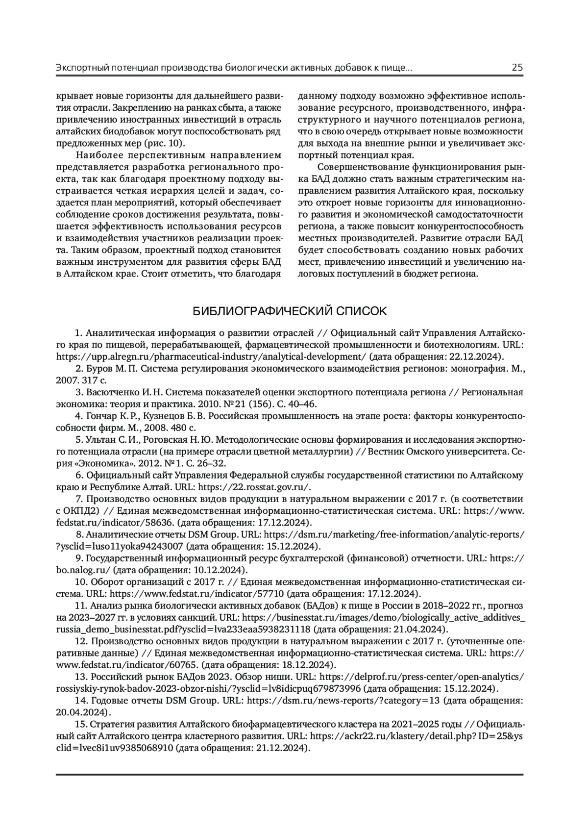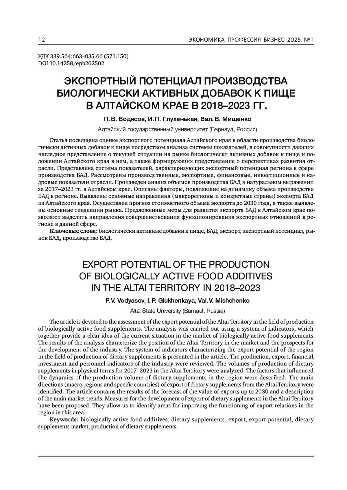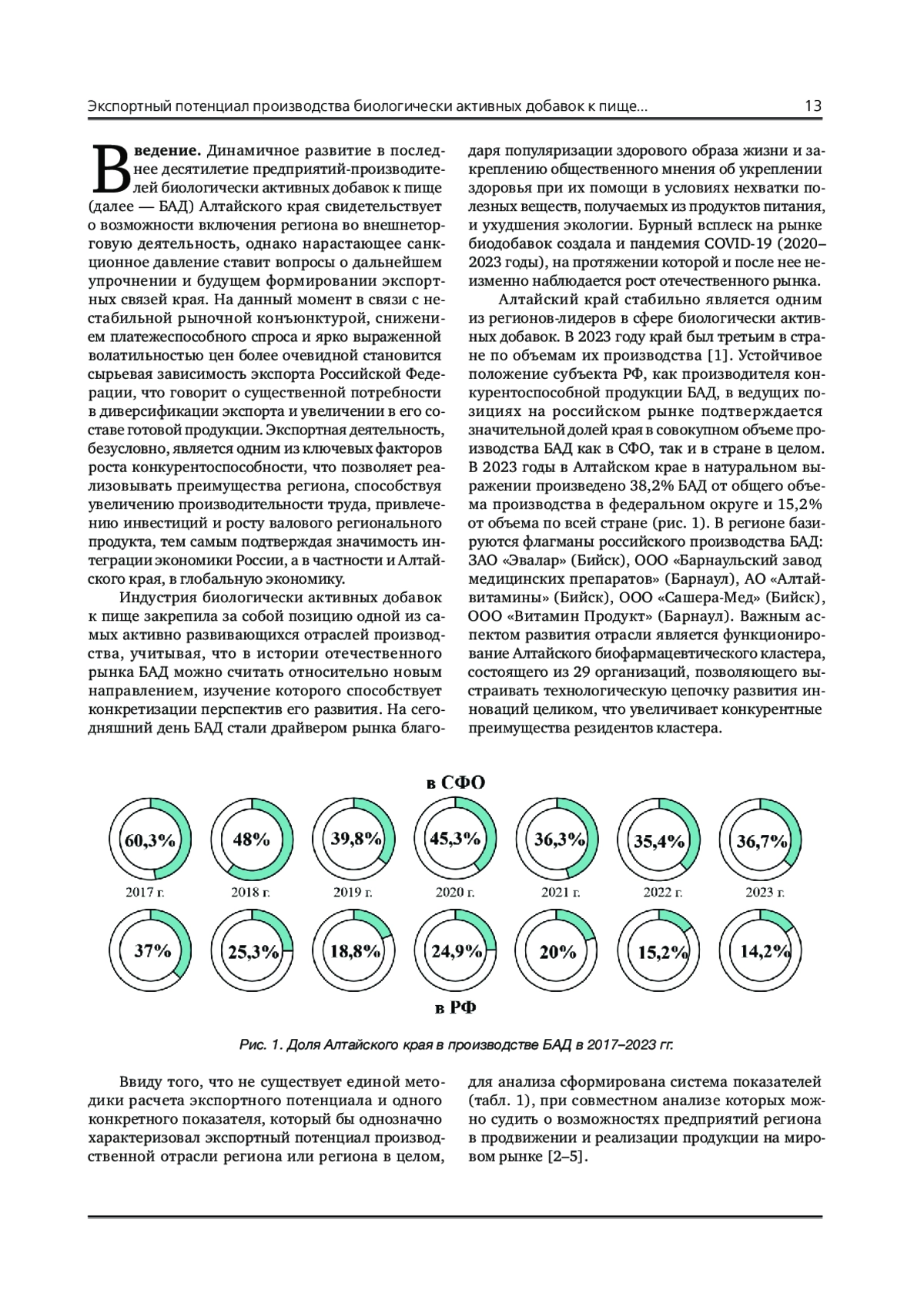 Введение. Динамичное развитие в последнее десятилетие предприятий-производителей биологически активных добавок к пище (далее — БАД) Алтайского края свидетельствует о возможности включения региона во внешнеторговую деятельность, однако нарастающее санкционное давление ставит вопросы о дальнейшем упрочнении и будущем формировании экспортных связей края. На данный момент в связи с нестабильной рыночной конъюнктурой, снижением платежеспособного спроса и ярко выраженной волатильностью цен более очевидной становится сырьевая зависимость экспорта Российской Федерации, что говорит о существенной потребности в диверсификации экспорта и увеличении в его составе готовой продукции. Экспортная деятельность, безусловно, является одним из ключевых факторов роста конкурентоспособности, что позволяет реализовывать преимущества региона, способствуя увеличению производительности труда, привлечению инвестиций и росту валового регионального продукта, тем самым подтверждая значимость интеграции экономики России, а в частности и Алтайского края, в глобальную экономику.