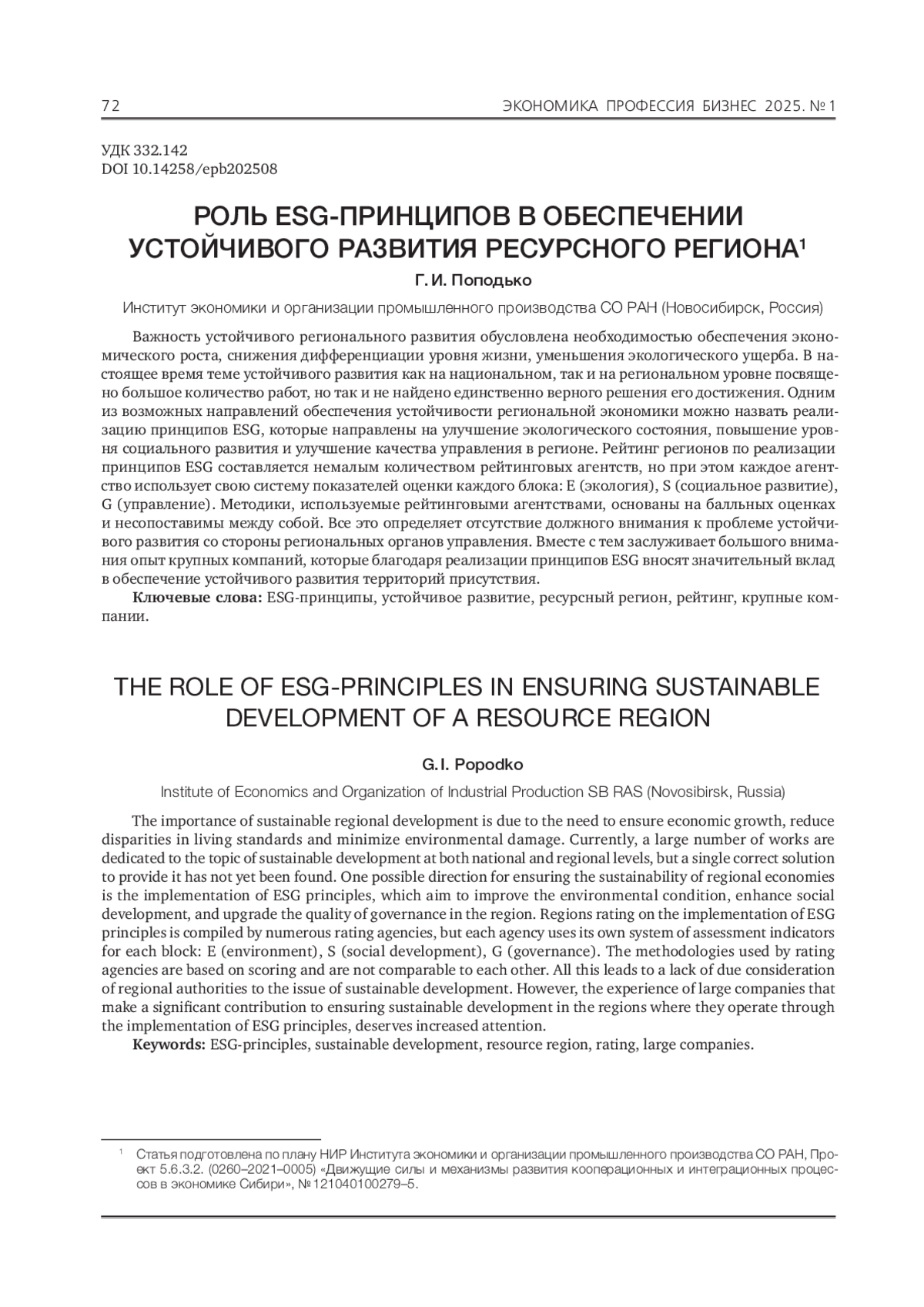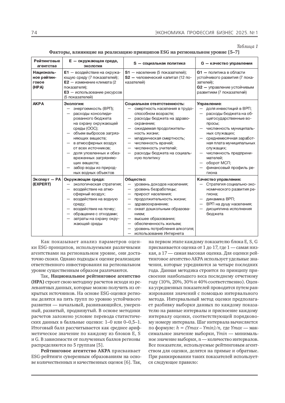 Одним из возможных направлений обеспечения устойчивости региональной экономики можно назвать реализацию принципов ESG, которые направлены на улучшение экологического состояния, повышение уровня социального развития и улучшение качества управления в регионе. Рейтинг регионов по реализации принципов ESG составляется немалым количеством рейтинговых агентств, но при этом каждое агентство использует свою систему показателей оценки каждого блока: E (экология), S (социальное развитие), G (управление).