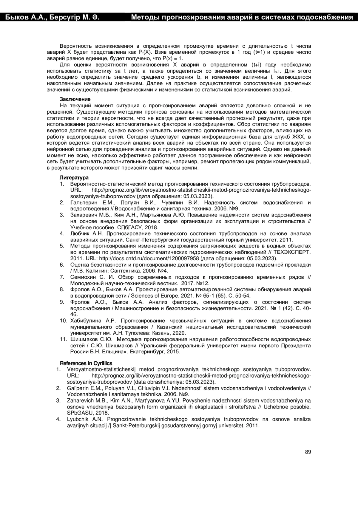 10. Хабибулина А.Р. Прогнозирование чрезвычайных ситуаций в системе водоснабжения муниципального образования / Казанский национальный исследовательский технический университет им. А.Н. Туполева: Казань, 2020.