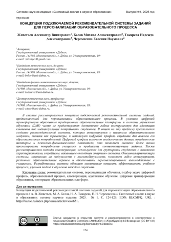 5. Живетьев, А. В. Агломеративная иерархическая кластеризация студентов на основе цифровых профилей с учетом категориальных данных / А. В. Живетьев, М. А. Белов // Автоматизация. Современные технологии. - 2025. - Т. 79, № 4. - C. 185-192. - -. DOI: 10.36652/0869-4931-2025-79-4-185-192 EDN: XGFSNL