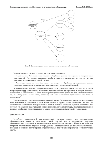 В статье рассматривается концепция подключаемой рекомендательной системы заданий, предназначенной для персонализации образовательного процесса. В условиях цифровой трансформации образования традиционные образовательные платформы и системы управления обучением (LMS) часто не предоставляют достаточно гибких инструментов для адаптации контента под индивидуальные потребности студентов. В ответ на эту проблему предлагается создание рекомендательной системы, которая интегрируется с внешними образовательными модулями, такими как тренажеры, и использует цифровой профиль студента для анализа его образовательных потребностей. Цифровой профиль включает академические данные, поведенческие паттерны и психолого-физиологические показатели, что позволяет системе более точно прогнозировать потребности учащегося и предлагать соответствующие задания. Также рассматриваются методы кластеризации, используемые для группировки студентов с похожими характеристиками, и проблемы, связанные с «холодным стартом» системы. Описанная архитектура системы, основанная на модульности и масштабируемости, позволяет гибко интегрировать различные образовательные сервисы и обеспечивать персонализированное взаимодействие с учащимися. Разработанная система обещает значительно повысить эффективность учебного процесса, улучшая подход к обучению каждого студента.