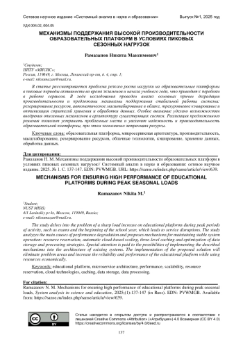 В статье рассматривается проблема резкого роста нагрузки на образовательные платформы в пиковые периоды активности во время экзаменов и начала учебного года, что приводит к перебоям в работе сервисов. В ходе исследования проведен анализ основных причин деградации производительности и предложены механизмы поддержания стабильной работы системы: резервирование ресурсов, автоматическое масштабирование в облаке, трехуровневое кэширование и оптимизация стратегий хранения и обработки данных. Особое внимание уделено возможностям внедрения описанных механизмов в архитектуру существующих систем. Реализация предложенного решения позволит устранить проблемные места и увеличит надежность и производительность образовательной платформы, при этом экономично затрачивая ресурсы.