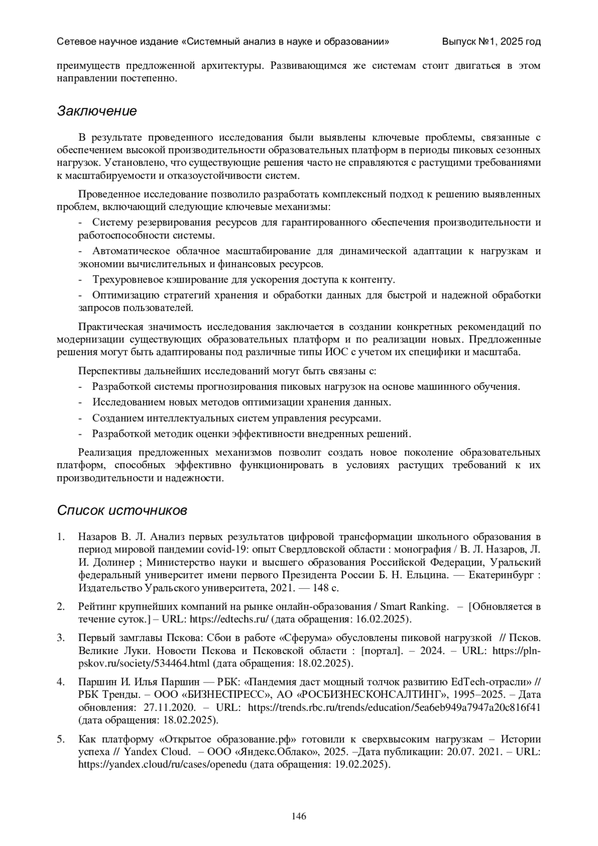 6. Как обеспечить бесперебойную работу обучающей платформы при скачках трафика: кейс “Учи.ру” // Инновационный центр “Сколково”.- Официальный сайт Фонда “Сколково”, 2025.- Дата публикации: 4.04.2022. - URL: https://sk.ru/news/kak-obespechit-besperebojnuyu-rabotu-obuchayushej-platformy-pri-skachkah-trafika-kejs-uchiru/(дата обращения: 19.02.2025).