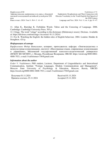 1. Баринова А. В. Виды и способы эвфемизации в современном русском литературном языке (на материале газет 1990-2006 гг.) [Электронный ресурс] // Вестник Красноярского государственного университета. Гуманитарные науки. 2006. № 6. С. 230-232. URL: https://bik. sfu-kras. ru/elib/view? id=PRSV-В982227/2006/Гуманитарные%20науки/6-712315205 (дата обращения: 01.10.2024). Barinova A. V. Vidy i sposoby evfemizatsii v sovremennom russkom literaturnom yazyke (na materiale gazet 1990-2006 gg.) [Elektronnyi resurs]. Vestnik Krasnoyarskogo gosudarstvennogo universiteta. Gumanitarnye nauki=Bulletin of Krasnoyarsk State University. Humanities. 2006, no. 6, pp. 230-232. Available at: https://bik. sfu-kras. ru/elib/view? id=PRSV-V982227/2006/Gumanitarnye%20nauki/6-712315205 (Accessed: 01.10.2024). 2. Большая Советская Энциклопедия: в 30 т. Т. 29: Чаган - Экс-ле-Бен. / ред. А. М. Прохоров, Н. К. Байбаков, А. А. Благонравов и др. 1978. М.: Советская Энциклопедия. 640 c. Bol’shaya Sovetskaya Entsiklopediya: v 30 t. T. 29: Chagan - Eks-le-Ben. In A. M. Prokhorov, N. K. Baibakov, A. A. Blagonravov et al. (eds.). 1978. Moscow: Sovetskaya Entsiklopediya. 640 p. 3. Воронцова Т. А. Культура речи: учеб. пособие. 2011. Ижевск: Удмурт. ун-т. 141, [1] с. Vorontsova T. A. Kul’tura rechi: ucheb. posobie. 2011. Izhevsk: Udmurt. un-t. 141, [1] p. 4. Дружинин А. С., Фомина Т. А., Поляков О. Г. Эвфемизмы, дисфемизмы, ортофемизмы и экспериенциальный контекст: холистический взгляд на лингвистическую проблему // Язык и культура. 2020. № 50. С. 23-40. EDN: KIZKXC Druzhinin A. S., Fomina T. A., Polyakov O. G. Evfemizmy, disfemizmy, ortofemizmy i eksperientsial’nyi kontekst: kholisticheskii vzglyad na lingvisticheskuyu problemu. Yazyk i kul’tura=Language and Culture. 2020, no. 50, pp. 23-40. EDN: KIZKXC 5. Засыпкин С. Инвектива [Электронный ресурс] // Дискурс-Пи. 2010. № 1-2. С. 352-353. URL: https://cyberleninka. ru/article/n/invektiva (дата обращения: 02.10.2024). EDN: TQLIZP Zasypkin S. Invektiva [Elektronnyi resurs]. Diskurs-Pi=Discourse-Pi. 2010, no. 1-2, pp. 352-353. Available at: https://cyberleninka. ru/article/n/invektiva (Accessed: 02.10.2024). 6. Кваскова Л. В. Дисфемизация речи как коммуникативная тактика в дискурсе // Преподаватель ХХI век. 2016. Т. 3. № 2. С. 352-357. URL: https://cyberleninka. ru/article/n/disfemizatsiya-rechi-kak-kommunikativnaya-taktika-v-diskurse (дата обращения: 03.10.2024). EDN: UJVLQJ Kvaskova L. V. Disfemizatsiya rechi kak kommunikativnaya taktika v diskurse. Prepodavatel’ XXI vek=Teacher XXI century. 2016. Vol. 3, no. 2, pp. 352-357. Available at: https://cyberleninka. ru/article/n/disfemizatsiya-rechi-kak-kommunikativnaya-taktika-v-diskurse (Accessed: 03.10.2024). 7. Кудрявцев А. Ю., Куропаткин Г. Д. Англо-русский словарь-справочник табуированной лексики и эвфемизмов: Ок. 10000 слов и выраж. 1993. М.: “КОМТ”, 1993. 304 с. Kudryavtsev A. Yu., Kuropatkin G. D. Anglo-russkii slovar’-spravochnik tabuirovannoi leksiki i evfemizmov: Ok. 10000 slov i vyrazh. 1993. Moscow: “KOMT”, 1993. 304 p. 8. Лингвистический энциклопедический словарь / гл. ред. В. Н. Ярцева. 1990. М.: Советская энциклопедия. 683 с. Lingvisticheskii entsiklopedicheskii slovar’. In V. N. Yartseva (ed.). 1990. Moscow: Sovetskaya entsiklopediya. 683 p. 9. Ставицкая Е. А. Упрощение языковой системы как следствие духовной деградации общества (на примере русского языка) // Вестник Московского государственного лингвистического университета. 2010. С. 15-21. Stavitskaya E. A. Uproshchenie yazykovoi sistemy kak sledstvie dukhovnoi degradatsii obshchestva (na primere russkogo yazyka). Vestnik Moskovskogo gosudarstvennogo lingvisticheskogo universiteta=Bulletin of Moscow State Linguistic University. 2010, pp. 15-21. 10. Успенский Б. А. Исследования по русской литературе, фольклору и мифологии. 2018. М.: Common place. 288 с. Uspenskii B. A. Issledovaniya po russkoi literature, fol’kloru i mifologii. 2018. Moscow: Common place. 288 p. 11. Allan K., Burridge K. Forbidden Words: Taboo and the Censoring of Language. 2006. Cambridge: Cambridge University Press. 303 p. 12. Cringe. The word “cringe” according to the dictionary [Электронный ресурс] // Dictious. URL: https://dictious. com/en/cringe (дата обращения: 01.11.2024). Cringe. The word “cringe” according to the dictionary [Elektronnyi resurs]. Dictious. Available at: https://dictious. com/en/cringe (Accessed: 01.11.2024). 13. Fox K. Watching the English: the hidden rules of English behaviour. 2004. London: Hodder & Stoughton. 424 p.