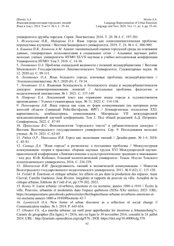 6. Леонтович О.А. Язык большого города: ключевые проблемы медиаурбанистики // Этнопсихолингвистика. № 3. 2020 (б). С. 19-34. EDN: TLRNAU