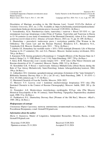 4. Дементьева Т.Ю. Прекращение и расторжение брака по древнерусскому праву // Вестник ВУиТ. 2013. №2 (78). URL: https://cyberleninka.ru/article/n/prekraschenie-i-rastorzhenie-braka-po-drevnerusskomu-pravu (дата обращения: 13.09.2024). EDN: RBAGHN
