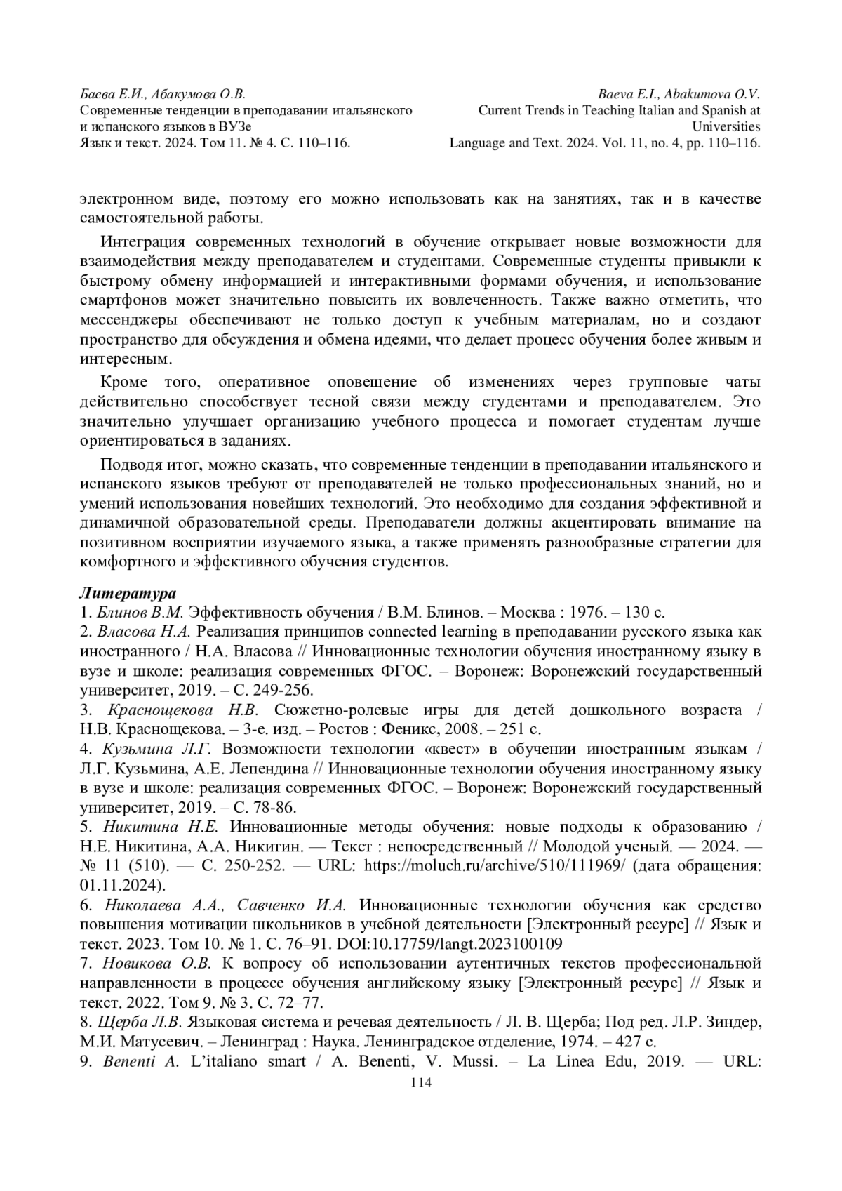 6. Николаева А.А., Савченко И.А. Инновационные технологии обучения как средство повышения мотивации школьников в учебной деятельности [Электронный ресурс] // Язык и текст. 2023. Том 10. № 1. C. 76-91. DOI: 10.17759/langt.2023100109 EDN: YIYLXK