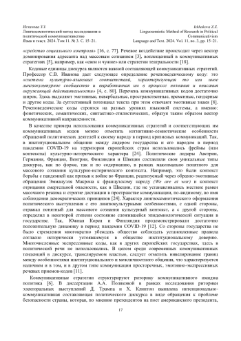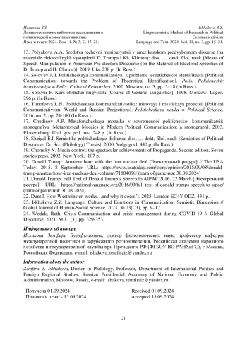 2. Гаврилова М.В. Лингвистический метод исследования политических коммуникаций // Политическая коммуникативистика: теория, методология и практика / Под ред. Л.Н.Тимофеевой. 2012. М.: Российская ассоциация политической науки (РАПН); Российская политическая энциклопедия (РОССПЭН). C. 258-278. EDN: PSFQKA