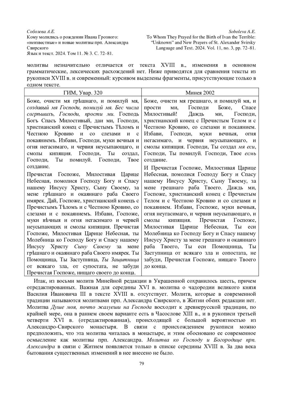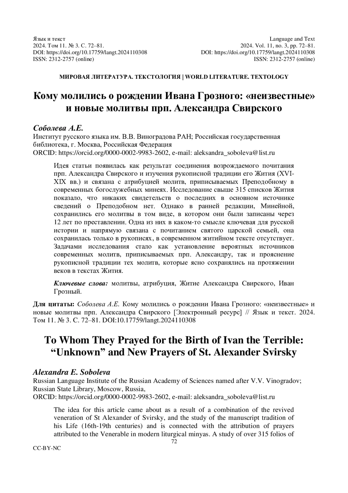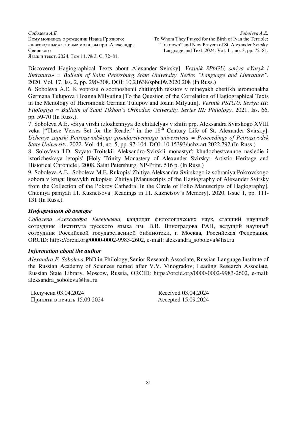 5. Соболева А.Е. Новонайденные ранние житийные тексты об Александре Свирском // Вестник СПбГУ, серия “Язык и литература”. 2020. Т. 17. Вып. 2. С. 290-308. DOI: 10.21638/spbu09.2020.208 EDN: BBHWAZ