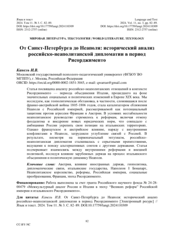 Статья посвящена анализу российско-неаполитанских отношений в контексте Рисорджименто - периода объединения Италии, прошедшего на фоне значительных социальных и политических изменений в Европе XIX века. Мы исследуем, как геополитическая обстановка, в частности, сложившаяся после франко-австрийской войны 1805-1806 годов, стала катализатором сближения Неаполя с Российской империей, рассматриваемой как потенциальный защитник против агрессии Франции и Австрии. В условиях нестабильности неаполитанское руководство стремилось к реформам, включая отмену феодализма и внедрение новых юридических норм, что совпадало с амбициями России укрепить свои позиции на итальянских территориях. Однако французское и австрийское влияние, наряду с внутренними конфликтами в Неаполе, затрудняли углубление связей с Россией. В результате, несмотря на первоначальный энтузиазм, российско-неаполитанская дипломатия сталкивалась с серьезными препятствиями, ведущими к поиску альтернативных союзов с другими державами. Статья подчеркивает взаимосвязь между внутренними реформами и внешней политикой, исследуя влияние зарубежных держав на процесс итальянского объединения и политическую динамику Неаполя.