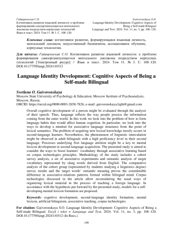 Формирование лексического знания протекает последовательно, по мере накопления индивидом жизненного опыта и в соответствии со ступенями его психофизического развития. Лингвокогнитивные репрезентации в билингвальном сознании формируются посредством установления ассоциаций, являющихся устойчивыми элементами памяти. Различие функционирования билингвального лексикона от монолингвального заключается в характере ассоциативных связей. Представленная статья посвящена экспериментальному изучению проблемы формирования и развития искусственной билингвальной языковой личности посредством корпусных технологий. В работе рассматриваются понятия когнитивных репрезентаций, ментального лексикона, ассоциаций, формирующейся языковой личности, когнитивно-прагматической программы и интеркаляции. Цель работы - проследить закономерности восприятия иноязычной лексики и ее интерпретации изучающими иностранный язык английский), а также определить степень целесообразности и обоснованности прямого применения корпусных технологий в процессе обучения иностранному языку для обеспечения условий когнитивного развития искусственного билингвизма у взрослых. Исследование проводилось посредством ряда методов, включая анкетирование, семантический анализ языковых данных (лексических единиц) и ассоциативный эксперимент (направленный и свободный). Исследуемая группа представлена студентами-лингвистами в возрасте от 18 до 25 лет, изучающими иностранный язык (английский) более 10 лет. Согласно сопоставительному анализу результатов анкетирования и семантического анализа исследуемой лексики, семантическое наполнение исследуемых заимствований в сознании испытуемых не является исчерпывающим, т. е. не соответствуют лексемам английского языка. Рассматриваемые в работе технологии корпусной лингвистики позволяют пересмотреть привычные способы организации лексического материала в процессе обучения иностранному языку. В соответствии с выдвигаемой исследованием гипотезой, предложены модели формирования саморазвивающего ментального лексикона, основанные на принципах моделирования когнитивно-прагматической программы.