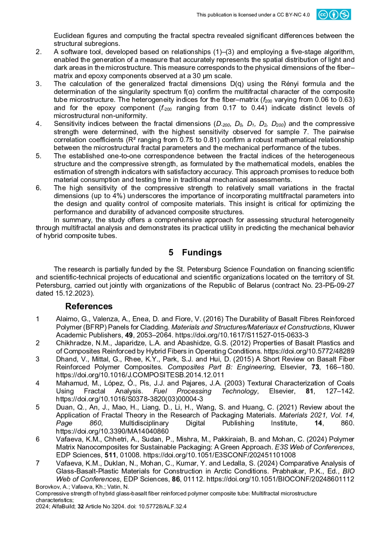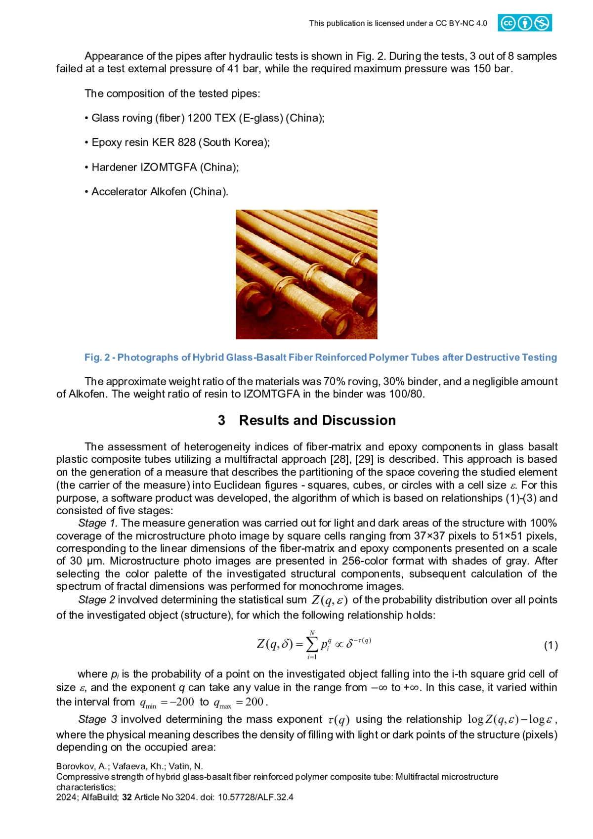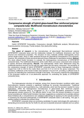 Объектом исследования является микроструктура труб из стекло-базальтопластика (GFRP/BFRP) и взаимосвязь между их мультифрактальными размерами и физико-механическими свойствами. Структура многих материалов характеризуется неоднородностью на различных длинах волн, которая часто оценивается по геометрическим характеристикам их элементов. Однако сложность этих структурных элементов затрудняет количественный анализ. Метод. В исследовании использовался фрактальный формализм для оценки неоднородной микроструктуры труб из стекло-базальтопластика. Для оценки структурной неоднородности были проанализированы мультифрактальные размеры матричных волокон и эпоксидного компонента. Результаты. Значения неоднородности были определены с помощью функции мультифрактального спектра f(α) как для матричных волокон, так и для эпоксидного компонента. Чувствительность прочности на сжатие гибридных композитных труб из стеклопластика/углепластика к этим показателям неоднородности варьировалась от 0,06 до 0,63 для матричных волокон и от 0,17 до 0,44 для эпоксидного компонента. Коэффициенты корреляции фрактальных моделей находились в диапазоне от 0,75 до 0,81, что обеспечивало достаточный уровень точности для оценки прочности труб на сжатие. Такая точность позволяет рассматривать предложенный метод как неразрушающий способ оценки качества композитных труб из стеклопластика/углепластика.