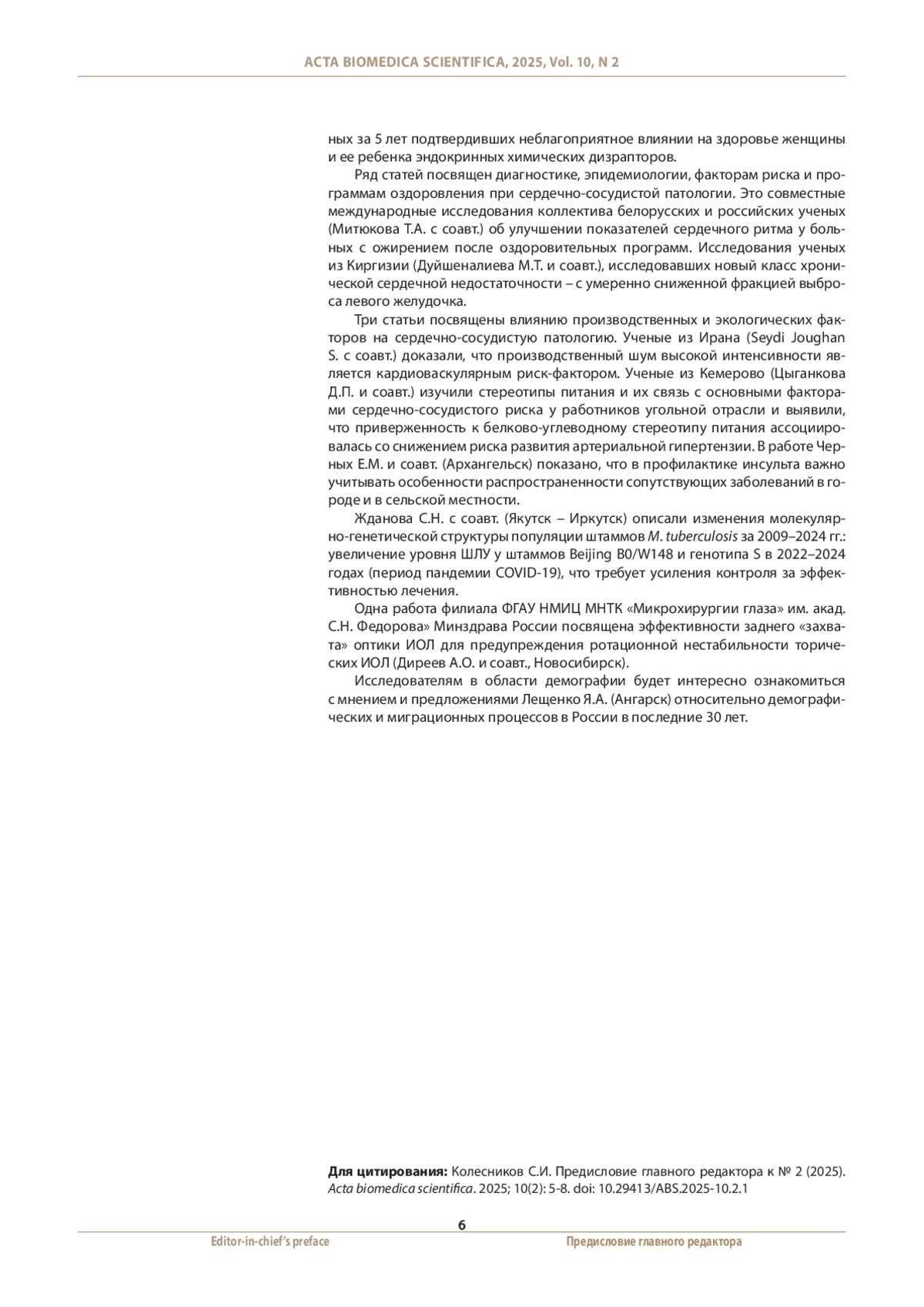 В номере, который Вы, уважаемые читатели, просмотрите с интересом, я бы выделил в первую очередь одну статью и два актуальных обзора. В исследовании Балжиевой В. В. и соавт. (Иркутск) определены показатели нездорового метаболичекого фенотипа у подростков разного пола монголоидной популяции Северной Азии. Обзор авторов из Москвы (Прохоренко И. Р. и соавт.) обращает внимание на важную роль гетеродимеров Толл-подобных рецепторов (TLR) и активируемых ими сигнальных путей в патогенезе заболеваний, что может способствовать созданию таргетных лекарств. Обзор Бутиковой Е. А. и соавт. (Новосибирск) посвящен пока малоизученным нетепловым биологическим воздействиям на клетки террагерцового излучения.
