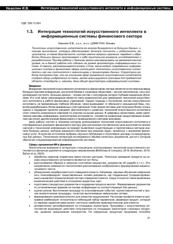 Внедрение технологий искусственного интеллекта в финансовом секторе является естественным ввиду большого массива информации, доступной банкам и страховым обществам – как уже накопленной, так и продолжающей поступать. Большие данные – основа систем с популярным сегодня глубоким машинным обучением. И в этой связи закономерным является поиск возможностей для применения технологий искусственного интеллекта в работе финансовых учреждений. Однако подходы к построению систем искусственного интеллекта, не применяющие глубокое обучение, также выигрывают от обильной и насыщенной базы, позволяя разрабатывать более выверенные с методической точки зрения системы для получения более точных оценок и поддержки принятия решений. Дополнительно к развитию технологий искусственного интеллекта стоит отметить возможности компаний по участию на рынке данных. В цифровых экосистемах, имея накопленные массивы информации, аналитические инструменты, становится возможным предоставление аналитики как услуги другим игрокам финансового и промышленного секторов экономики.