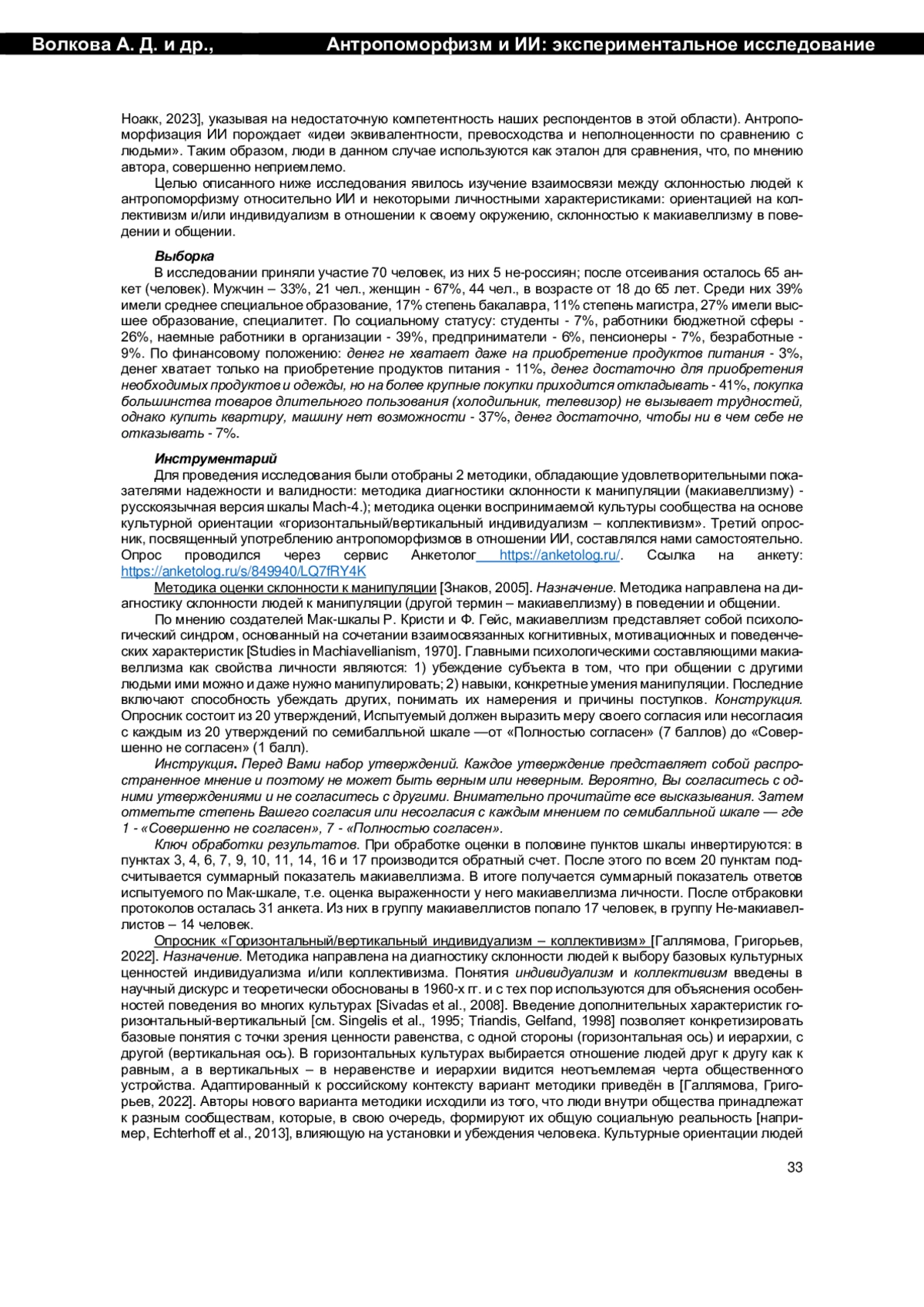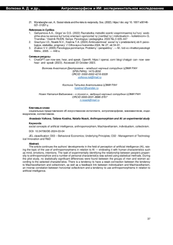 В 2023 году нами было проведено исследование социальных представлений об искусственном интеллекте среди россиян-неспециалистов в этой области. Результаты были описаны в [Грачёв, Костина, Ноакк, 2023]. В ходе исследования была выявлена группа респондентов, активно использующих антропоморфную лексику в описании ИИ. Было получено большое число оценок, в которых задействованы «человеческие» характеристики ИИ. Они обозначали определённые операции ИИ («действия» ИИ (думает), черты характера (дружелюбный, честный), с помощью этих слов давались общие характеристики ИИ (мозг). Одновременно были собраны данные по ценностным приоритетам респондентов. Оказалось, что антропоморфной лексики в группе респондентов, поставивших на первые места «Ценности общества», в 3 раза меньше, чем в группе выбравших «Автономию» в качестве приоритетной ценности (11% и 34%, соответственно). Безусловно, эти результаты носили предварительный характер и нуждались в дополнительных исследованиях. Но именно они запустили наш поиск в области антропоморфизма в восприятии ИИ.